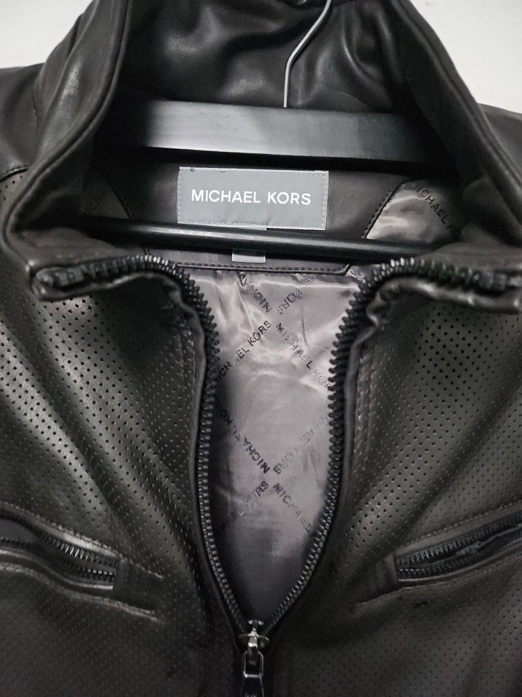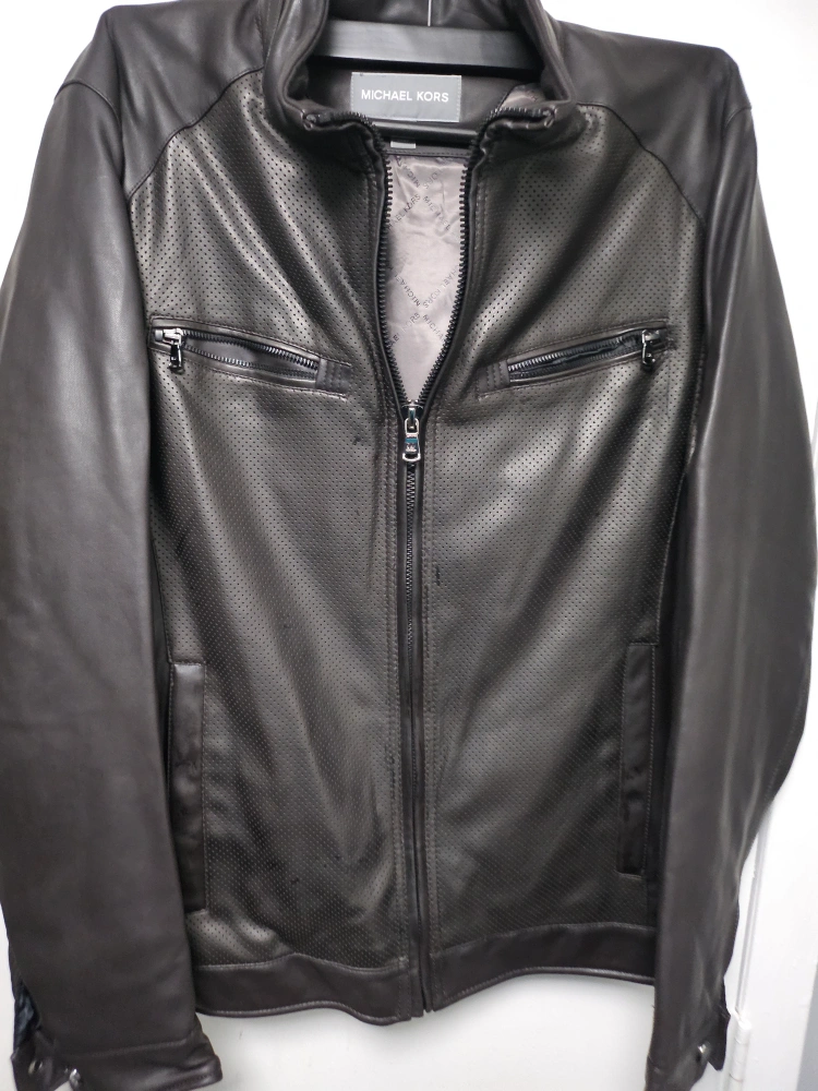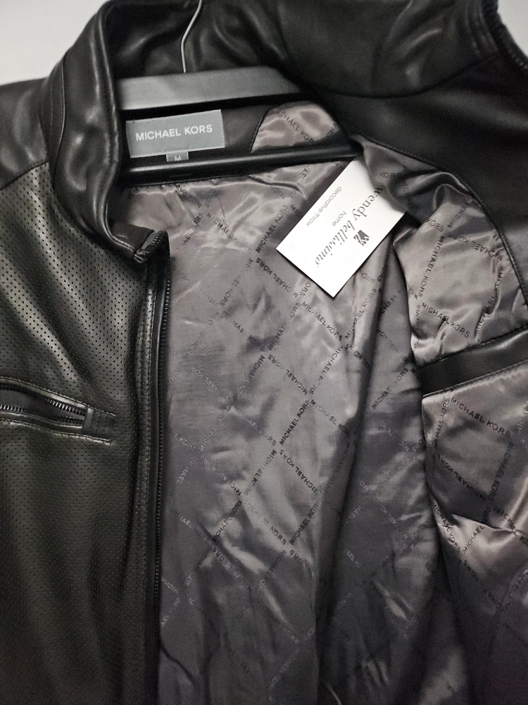 Selling a stylish Michael Kors brown leather jacket in size M. The jacket features a sleek design with perforated detailing. It's made of high-quality leather and has a comfortable lining. Perfect for adding a touch of sophistication to any outfit!