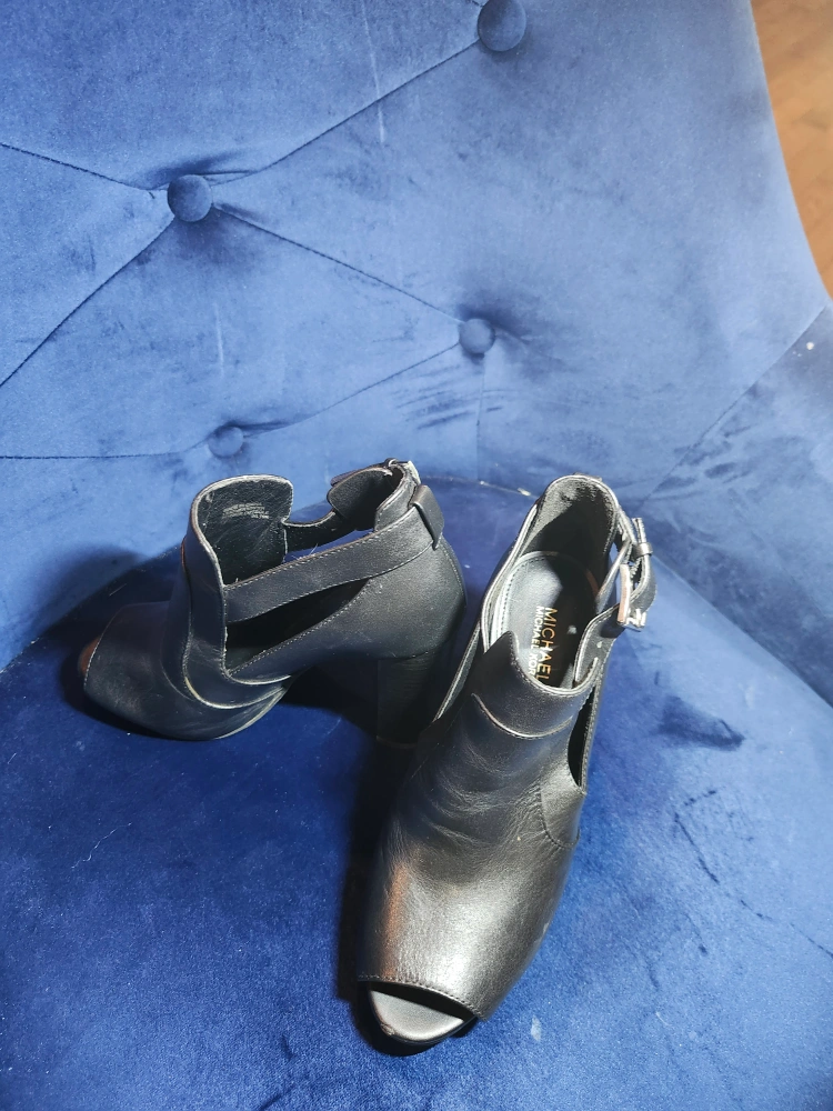 These are a cute pair of black leather peep toe booties from Michael Kors! They feature a block heel and a buckle detail on the side