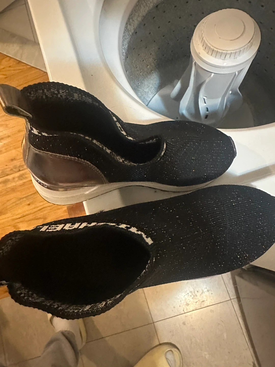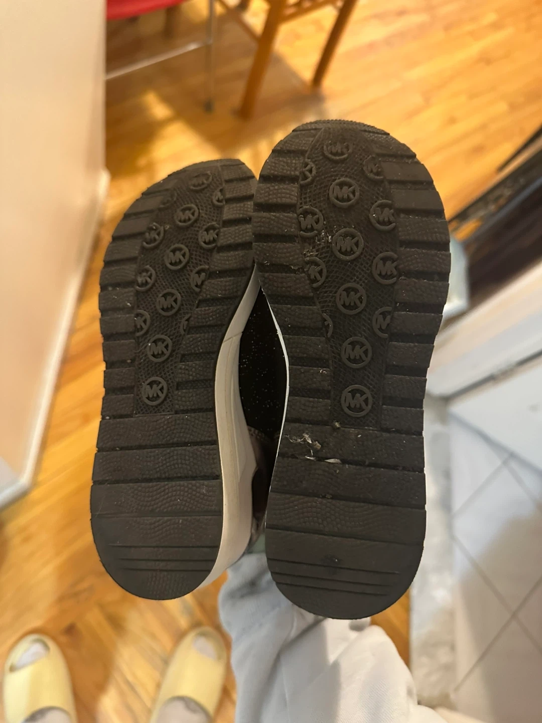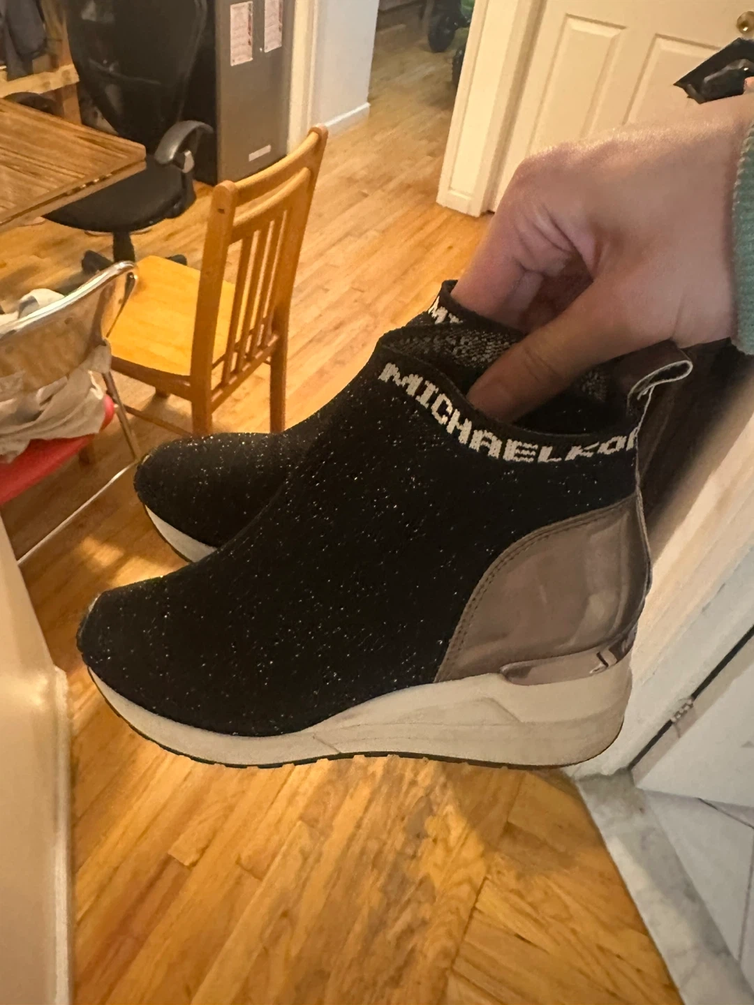 91Selling a pair of Michael Kors black wedge sneakers. They have a stylish design and are in good condition. The shoes feature the MK logo on the soles and 'MICHAEL KORS' printed around the ankle area. Perfect for adding a bit of height and style to your casual outfits!