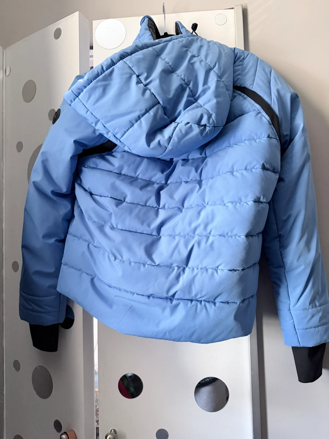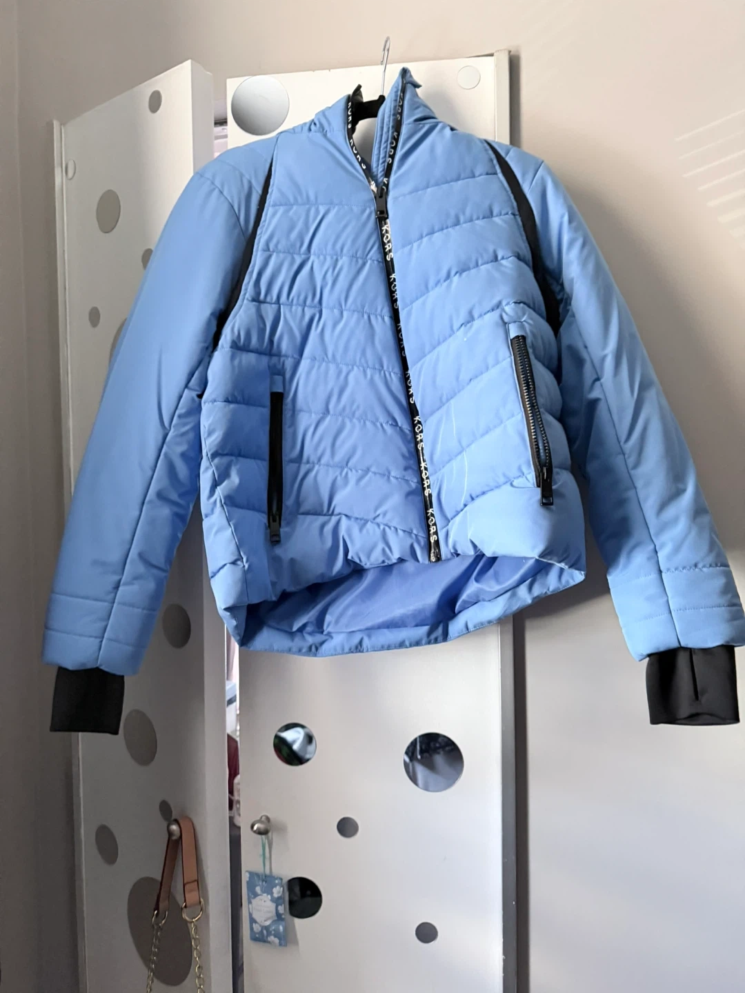 65Selling a Michael Kors puffer jacket in a lovely light blue color. It features black accents and the Michael Kors logo on the zipper. Perfect for staying warm and stylish!