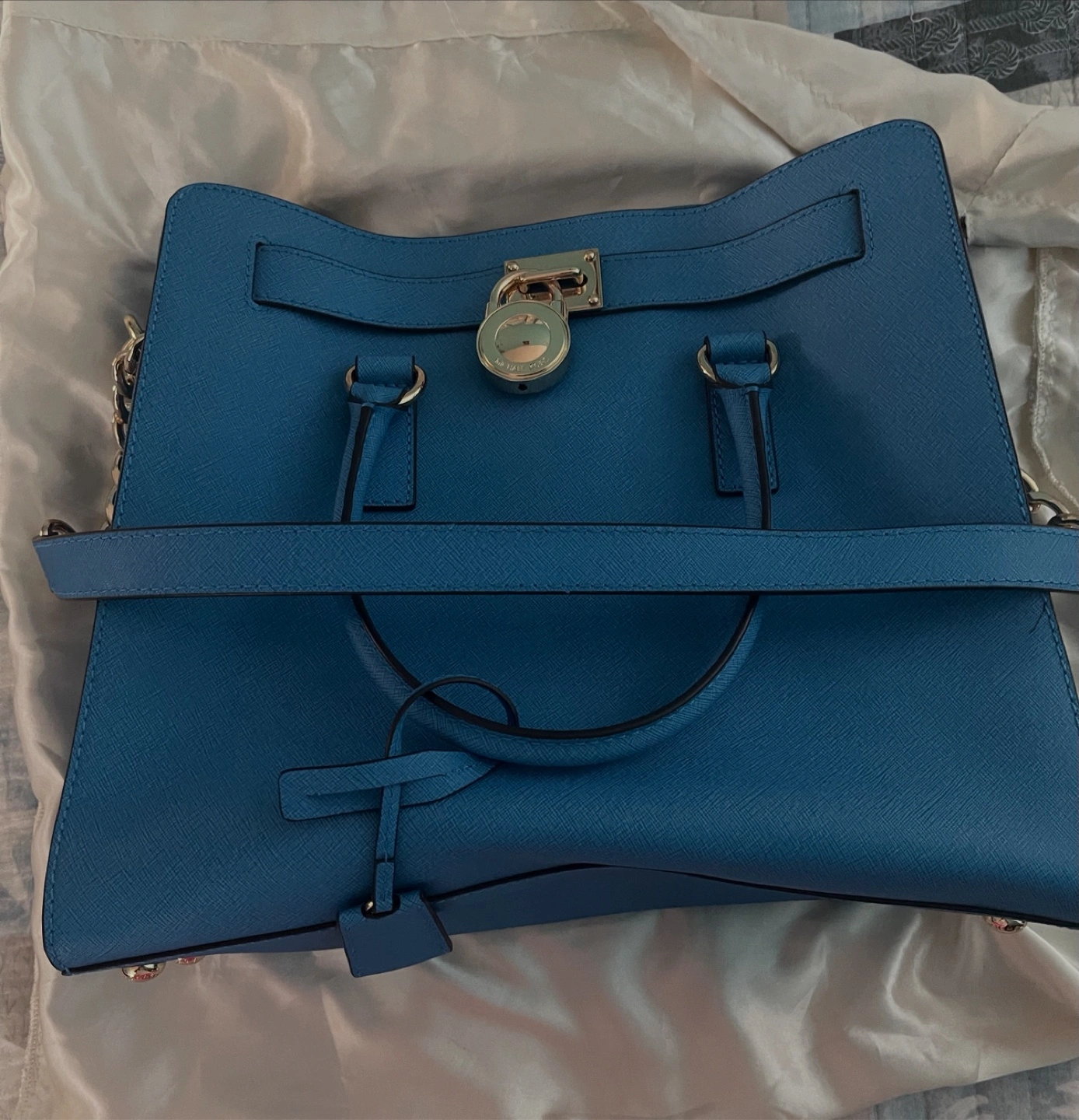 Bright blue handbag with a classic satchel design. It has a top handle and a shoulder strap. The bag features a lock closure and gold-tone hardware. You can use this bag to easily carry all your essentials, making your day more relaxed.