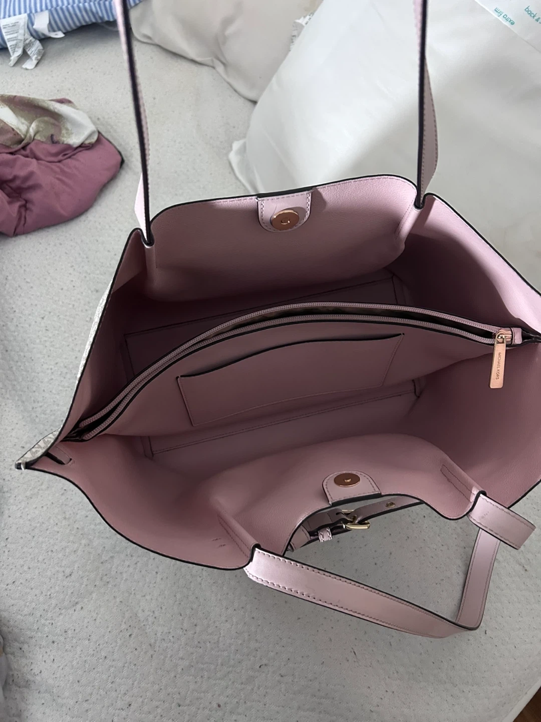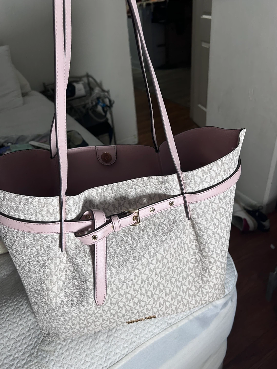 60This is a Michael Kors tote bag in good condition! It features the classic MK logo pattern and pink accents. Perfect for everyday use