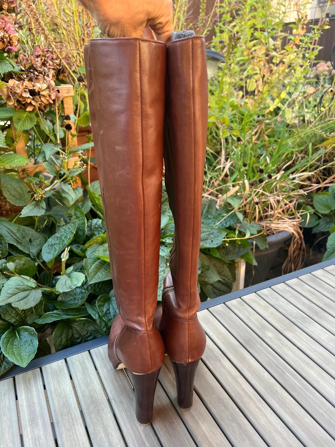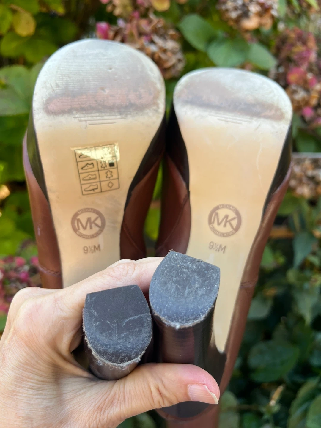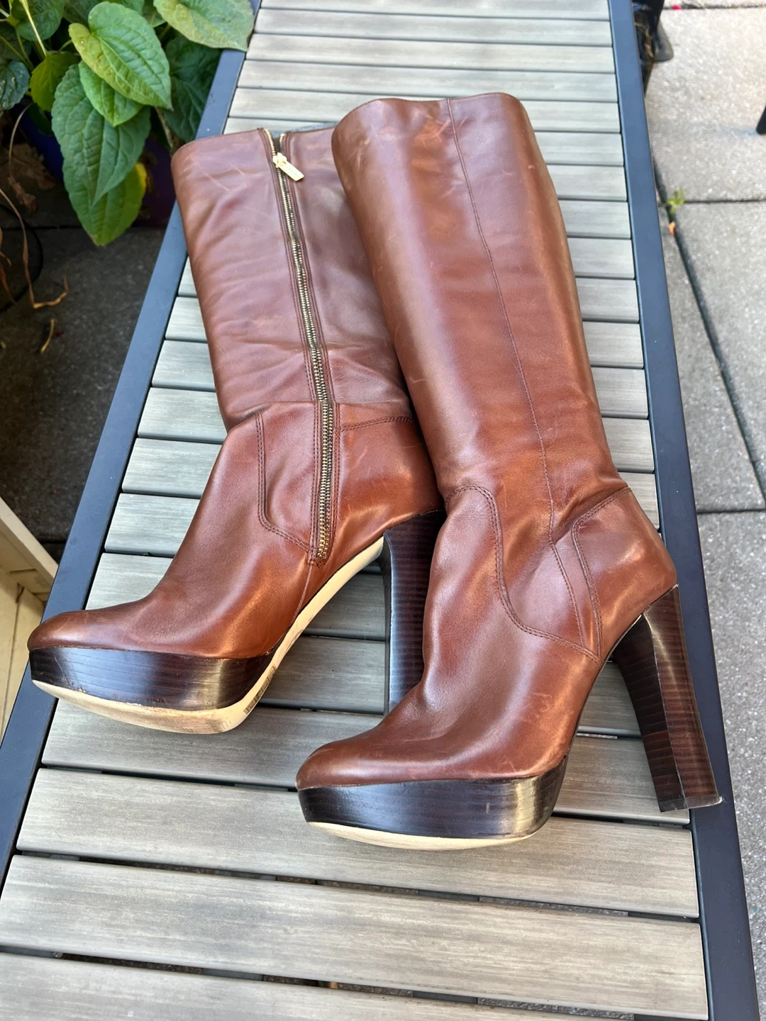 These are a pair of Michael Kors brown leather knee-high boots with a heel. They feature a zipper and have a stylish look. Great for fall!