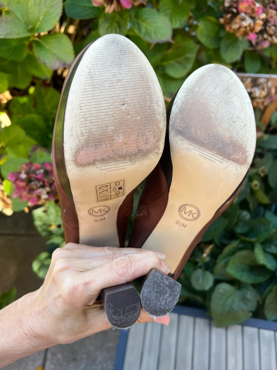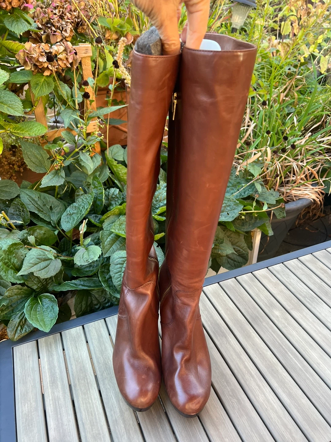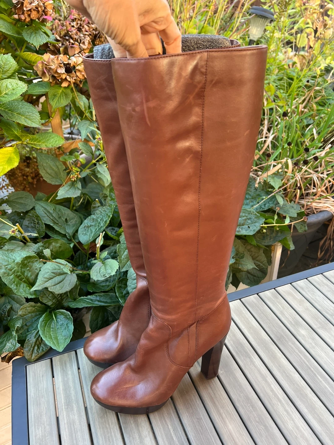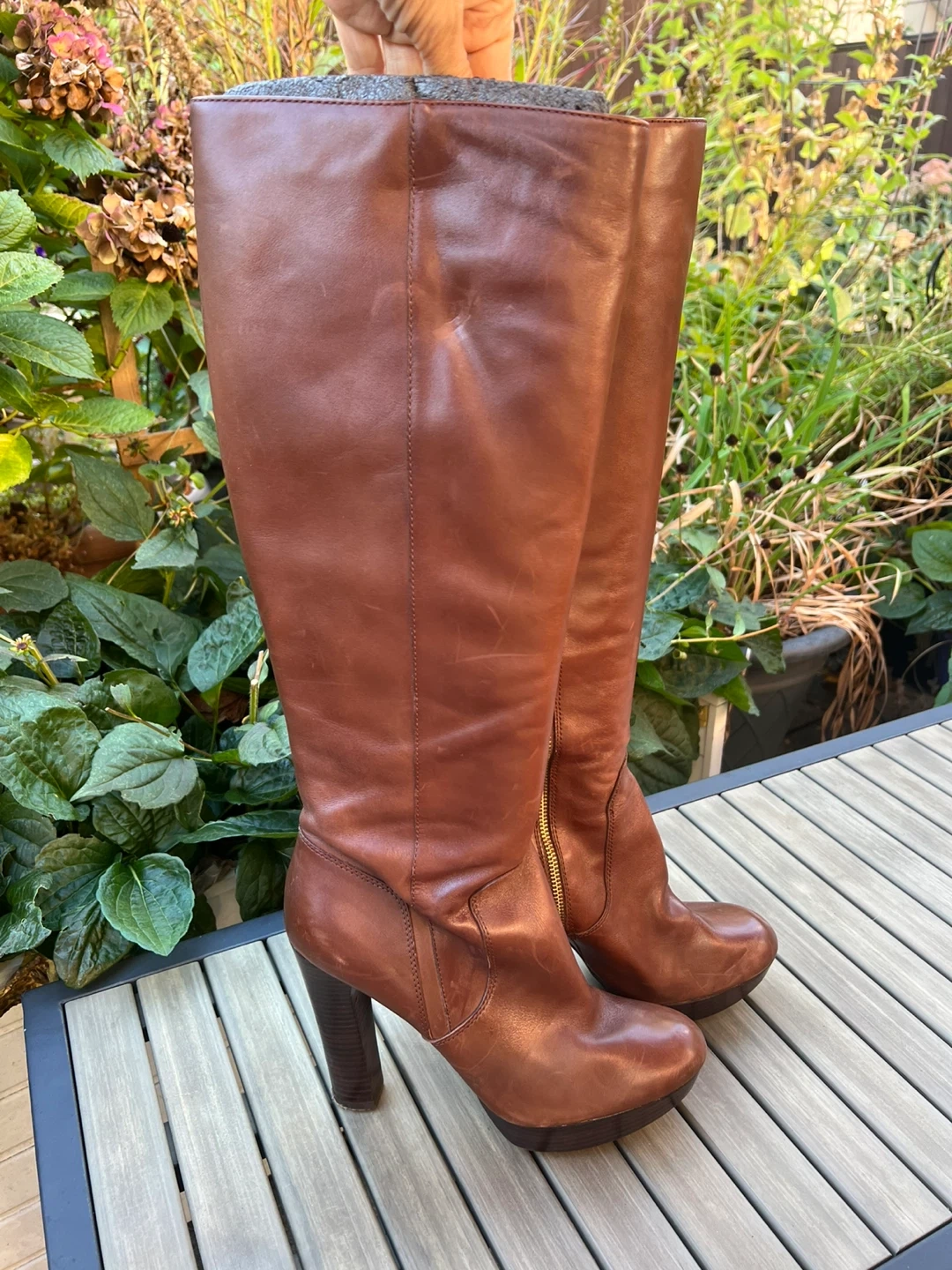 These are a pair of Michael Kors brown leather knee-high boots with a heel. They feature a zipper and have a stylish look. Great for fall!