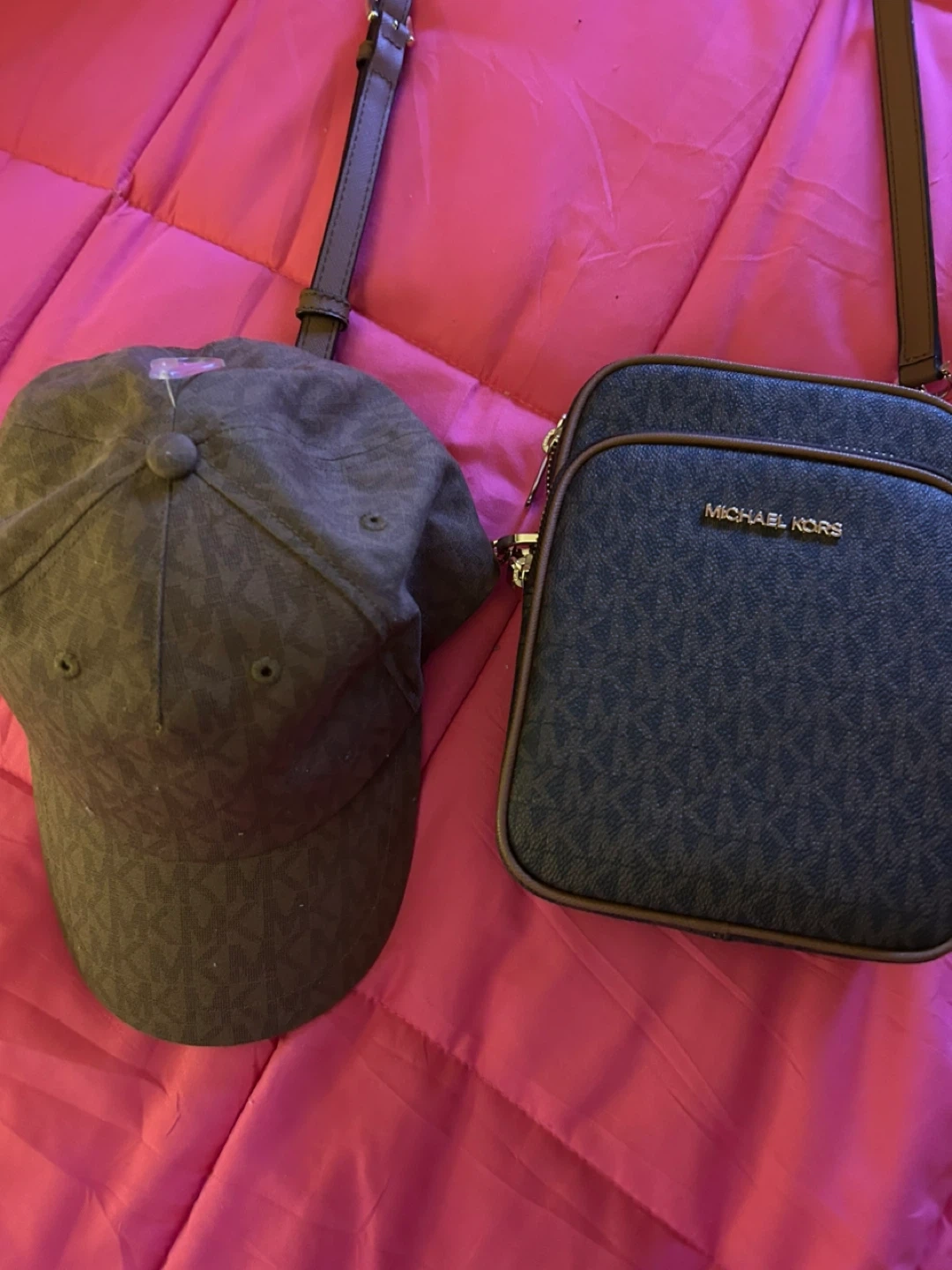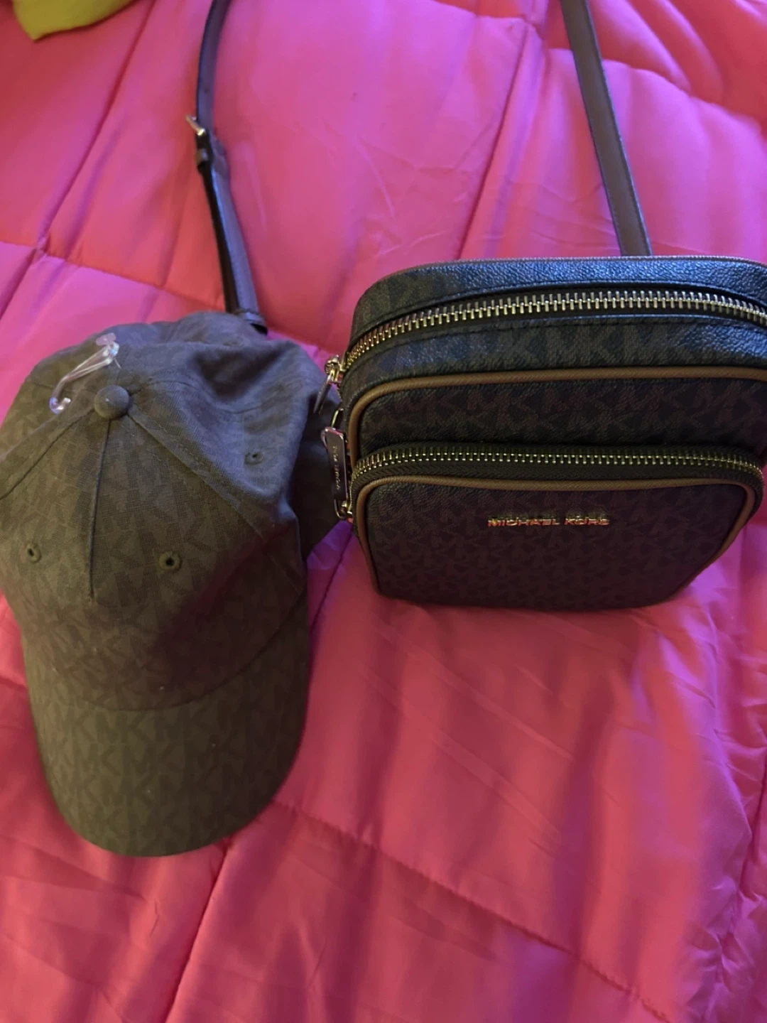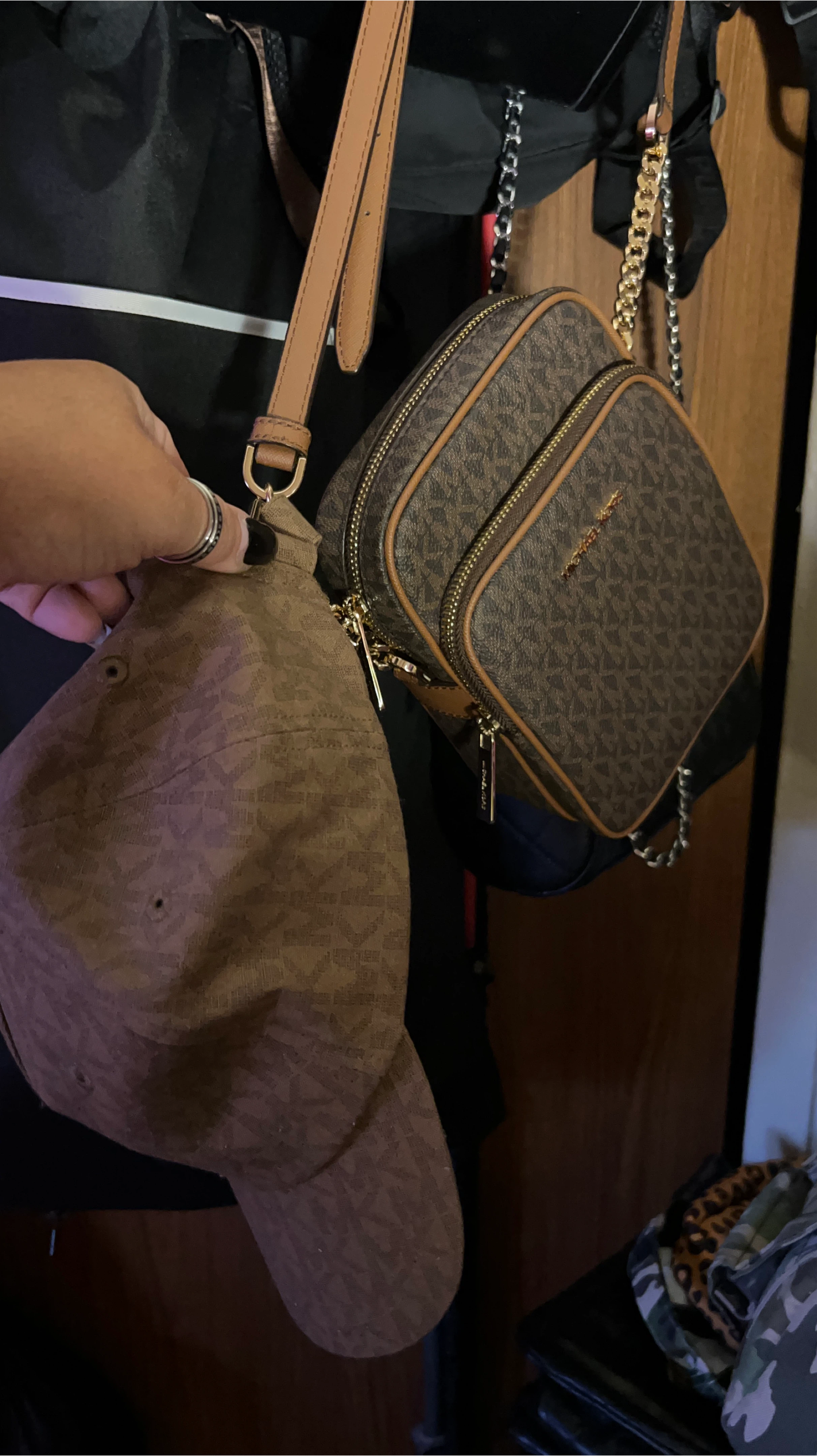 48Selling a cute matching Michael Kors crossbody bag and hat set! Both items feature the signature MK logo pattern in brown tones. The bag has a convenient size for everyday essentials, and the hat is a stylish accessory. Perfect for completing your look!