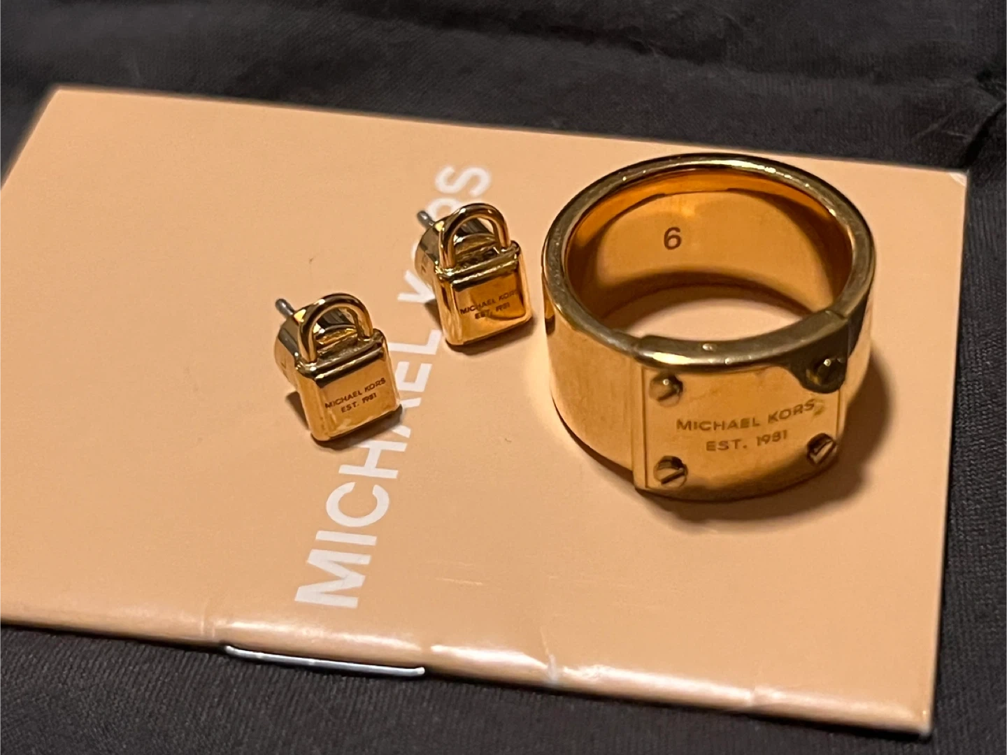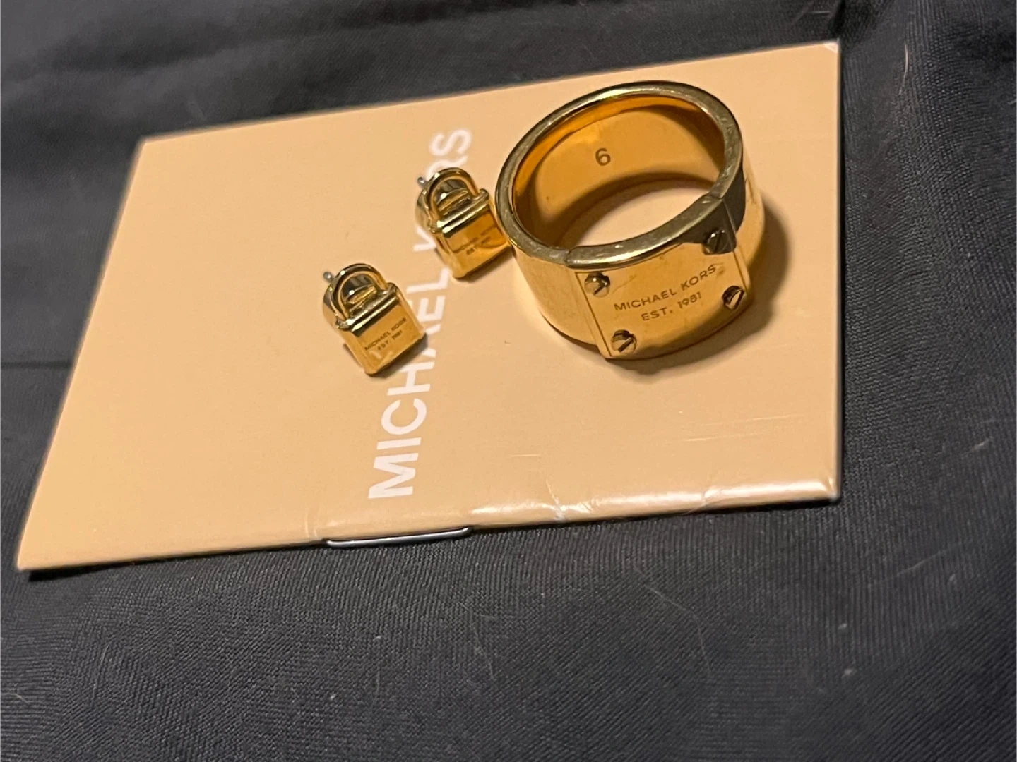 65Selling a cute Michael Kors set! It includes lock earrings and a matching ring in size 6. They are gold and in great condition!