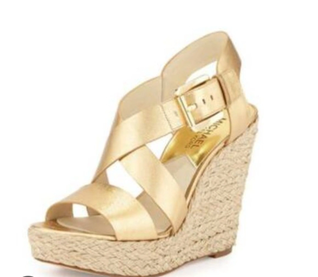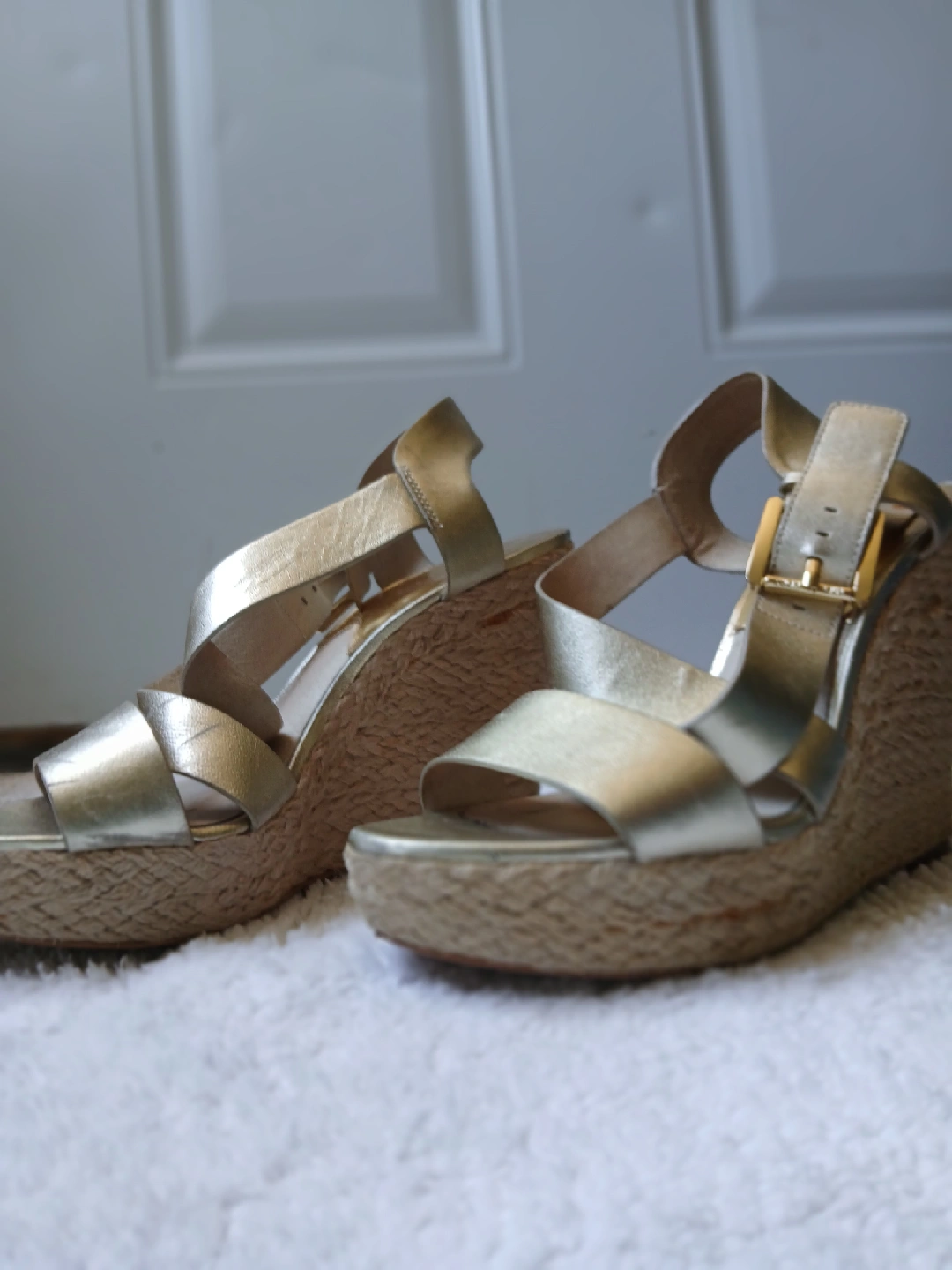 65Selling a pair of Michael Kors gold wedge sandals in size 9M. They feature a stylish cross strap design and a comfortable wedge heel. Perfect for adding a touch of elegance to any outfit!