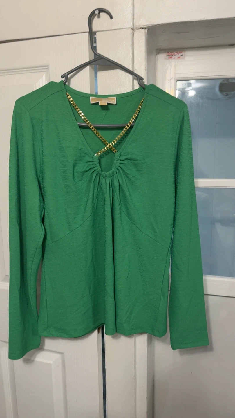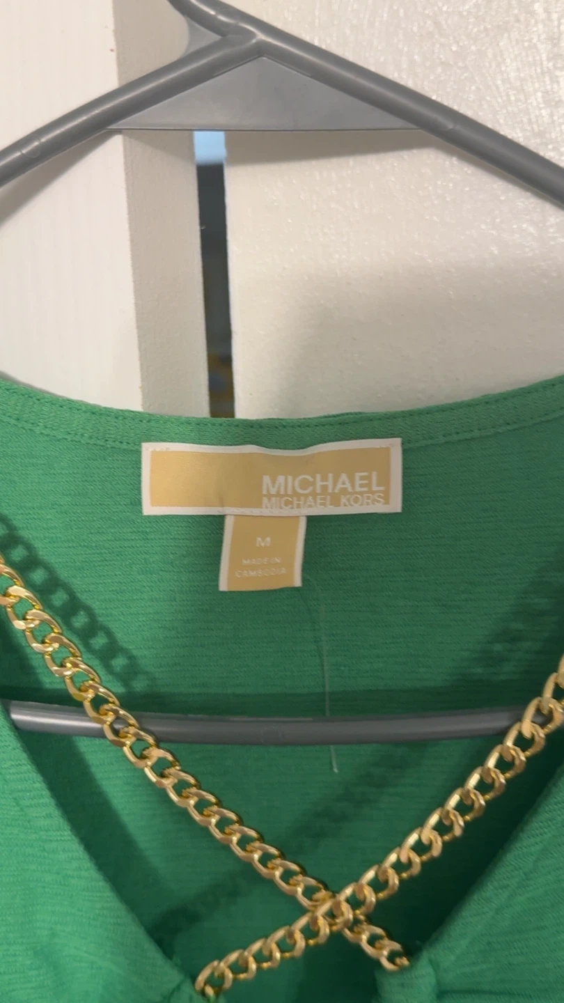 Selling a stylish green blouse from Michael Kors! It features a unique chain detail around the neckline and is a size medium. Perfect for adding a pop of color to your wardrobe and can be dressed up or down