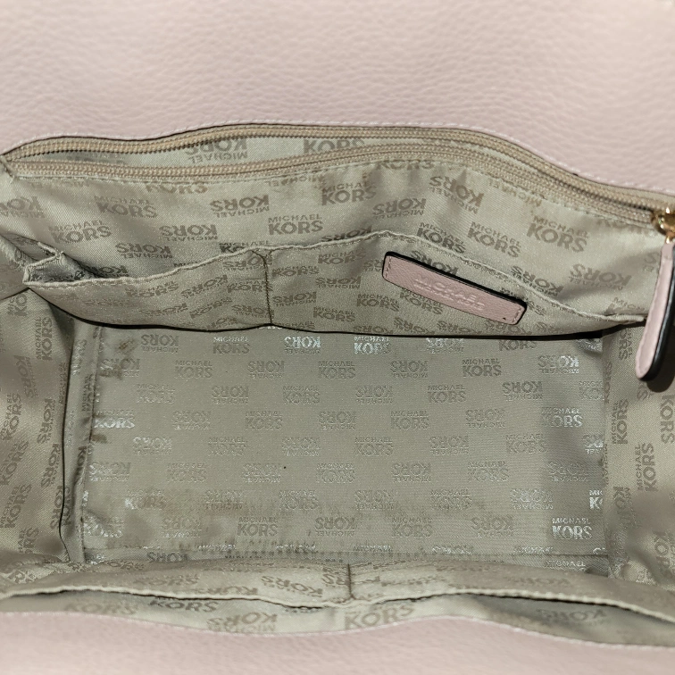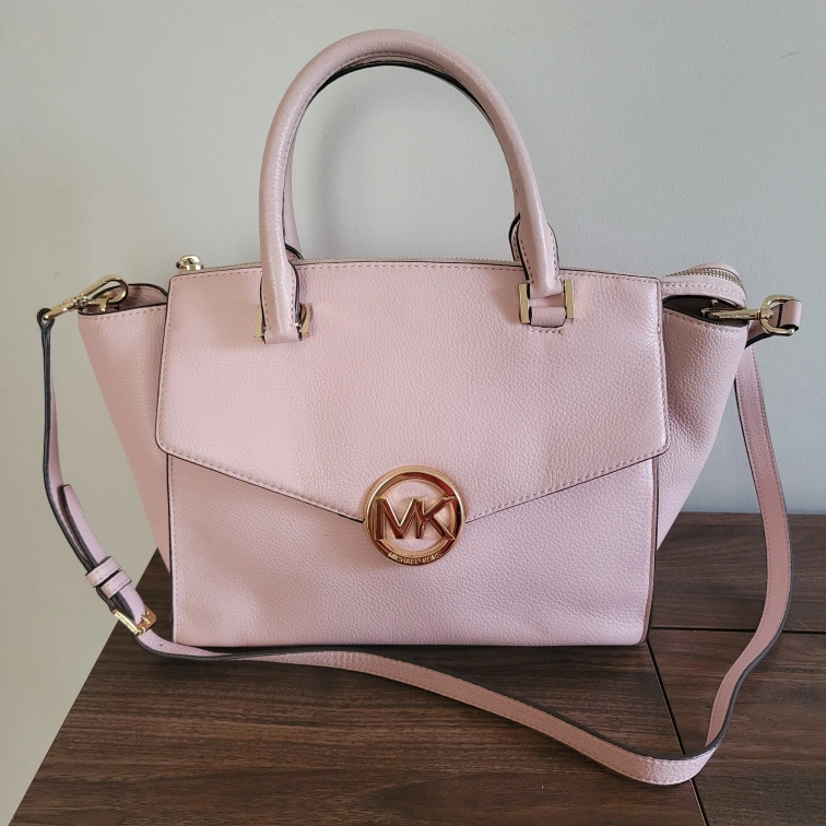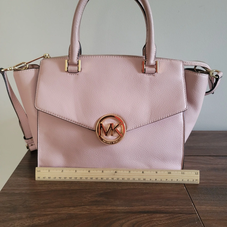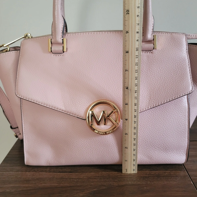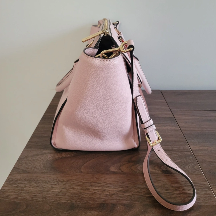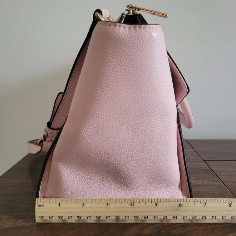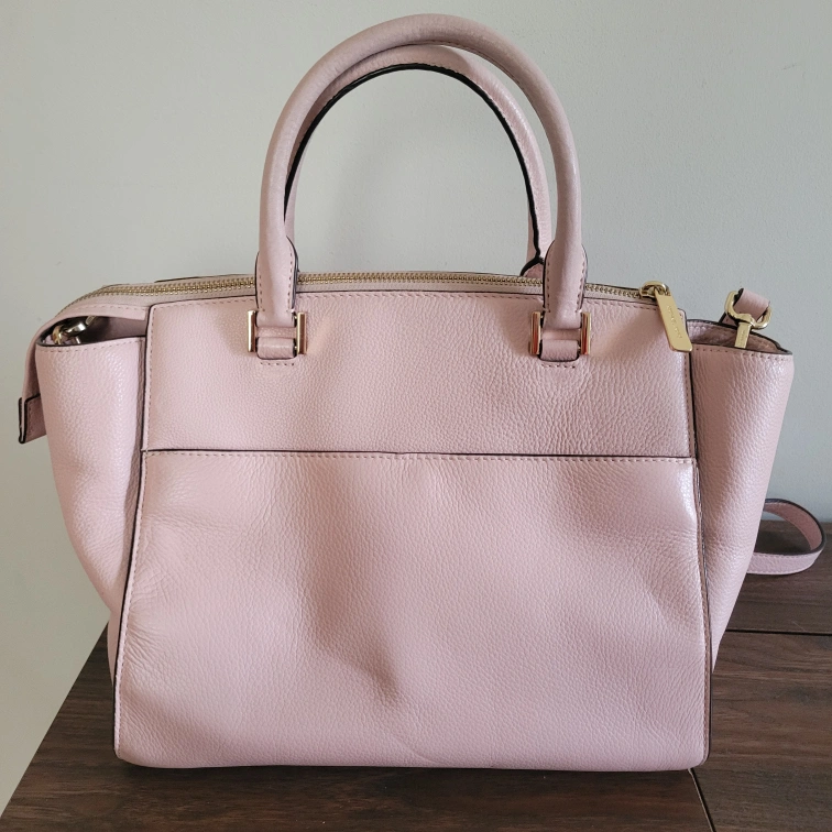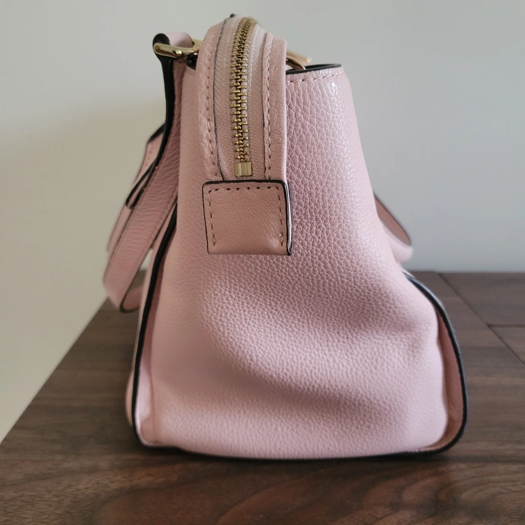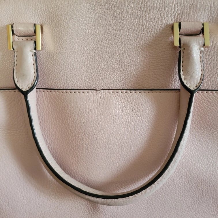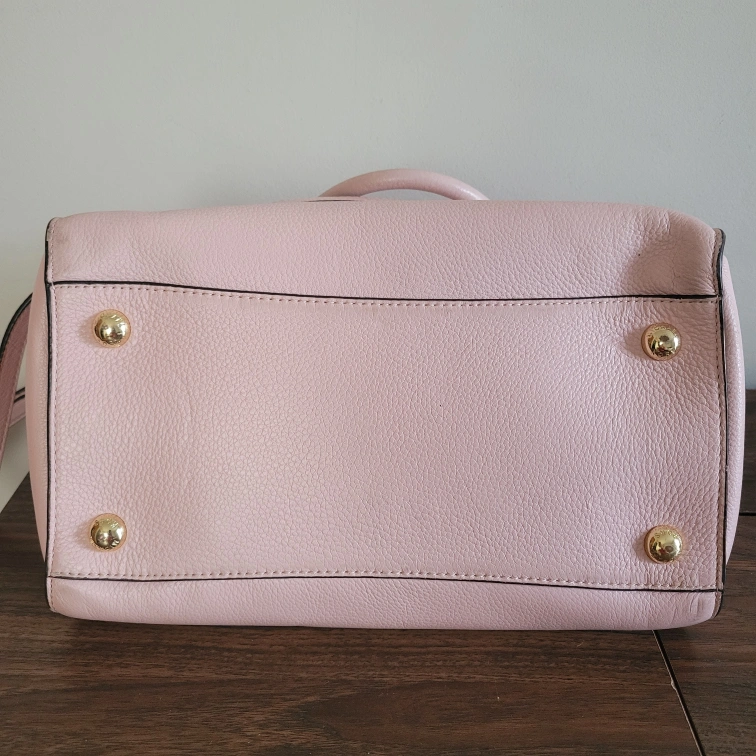 10Slightly dirty on the handle connected to back of bag (see last picture). There are two short handles if you wish to carry it like a tote or satchel and then one long adjustable strap to wear it on your shoulder or as a crossbody. Please see pictures for size/measurements. Item is stored in a smoke-free and pet-free environment. Cash only and no returns. Must pick up. Product Details: - Light Pink Handbag #35H4GHUS3L - Pebbled Leather - Gold Tone Hardware - Zip Closure - 2 Handles w/ Detachable Adjustable Strap - Handle Drop is 6" - Medium Size Handbag
