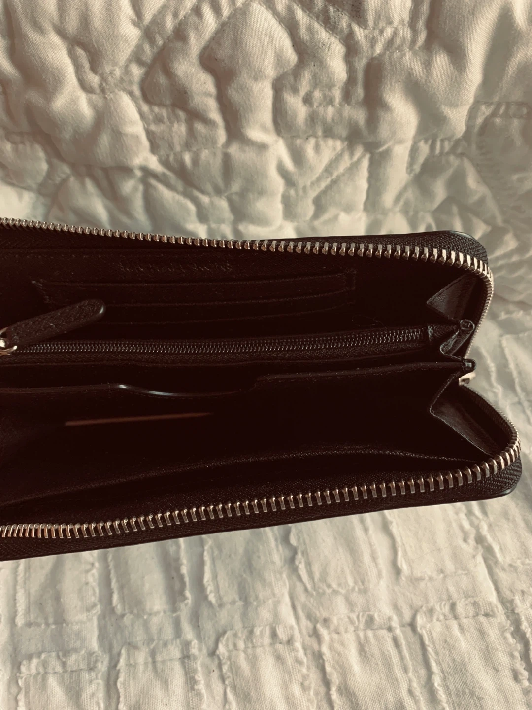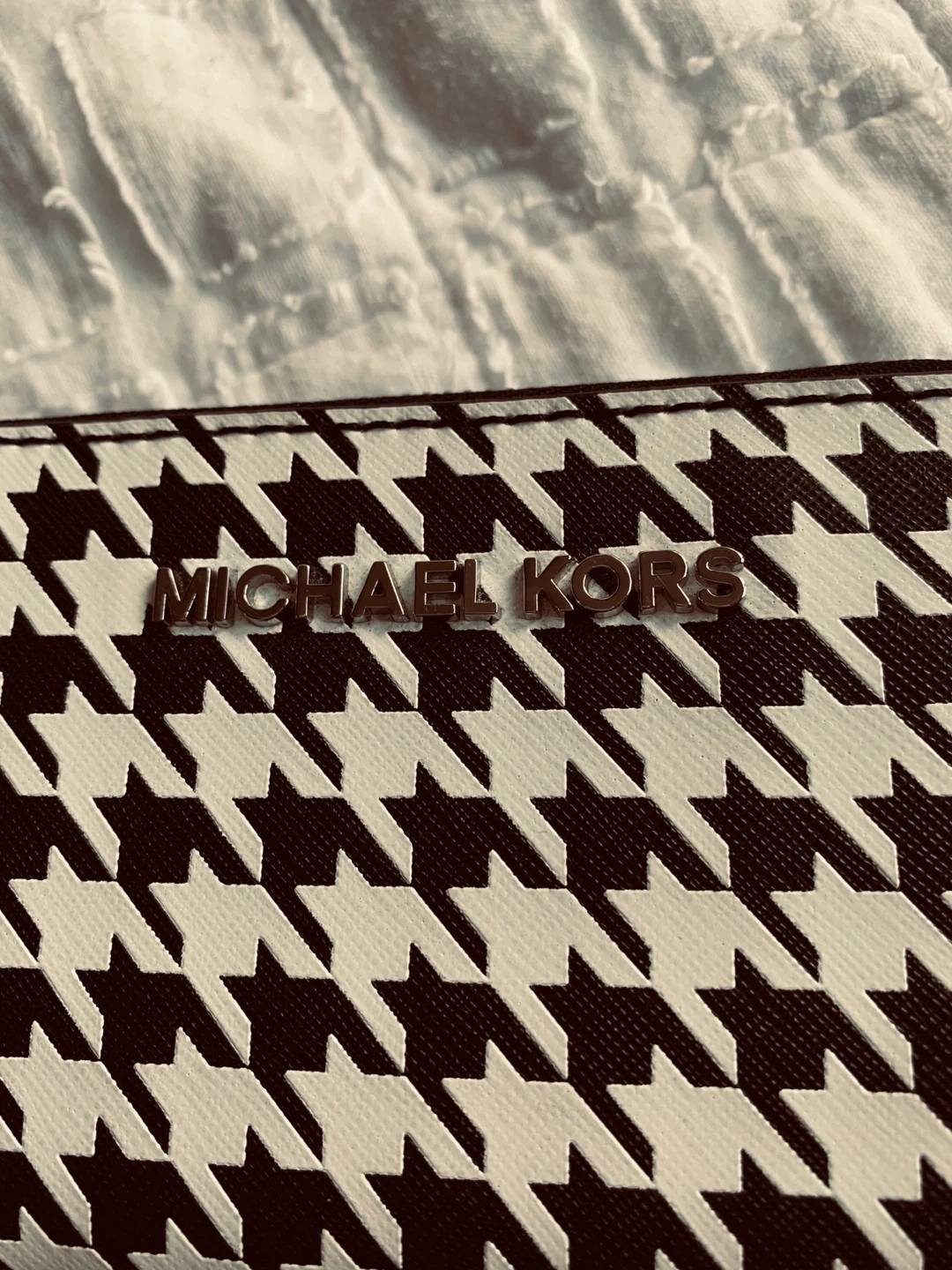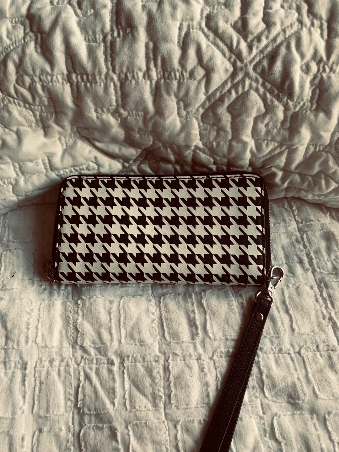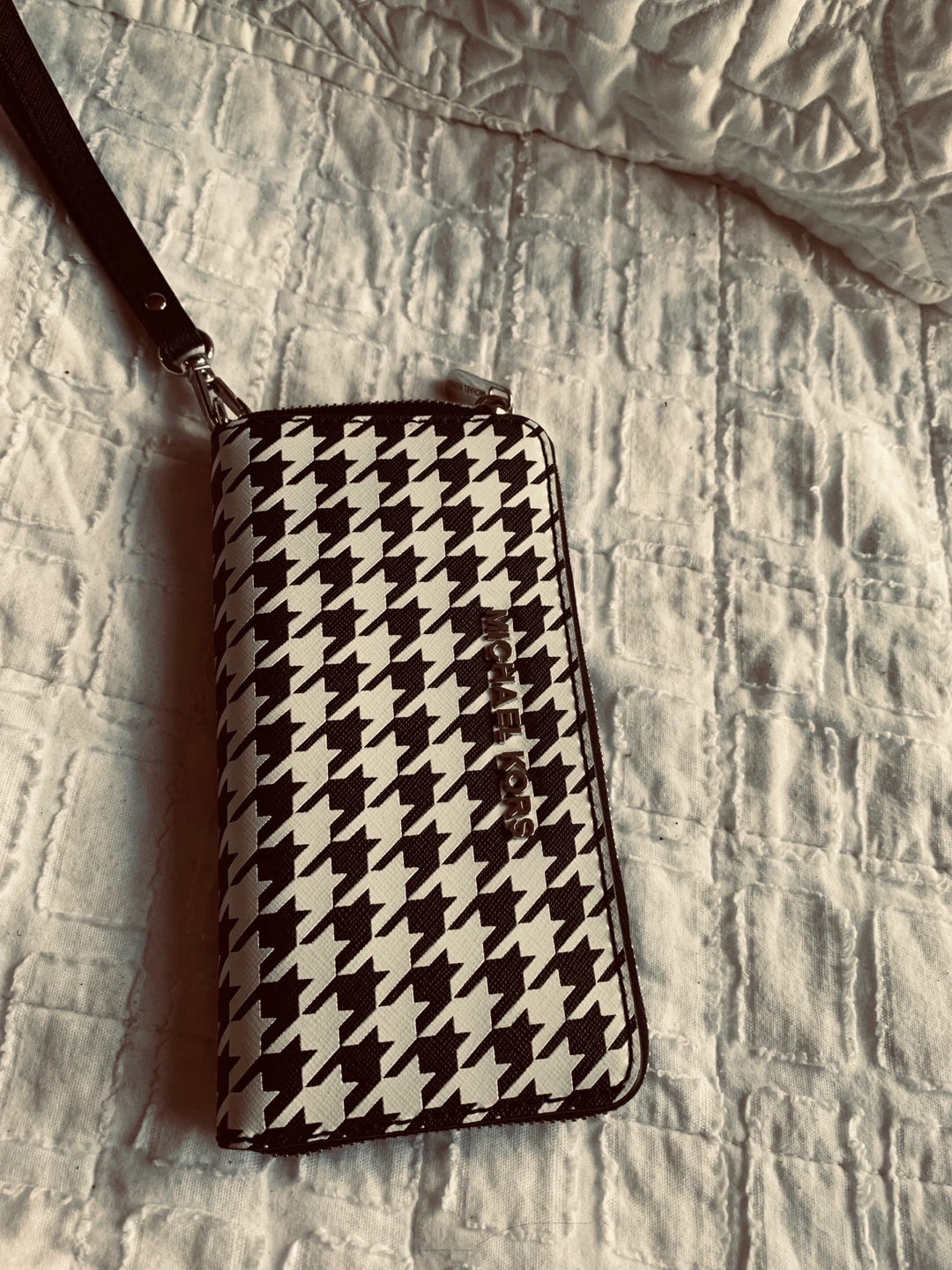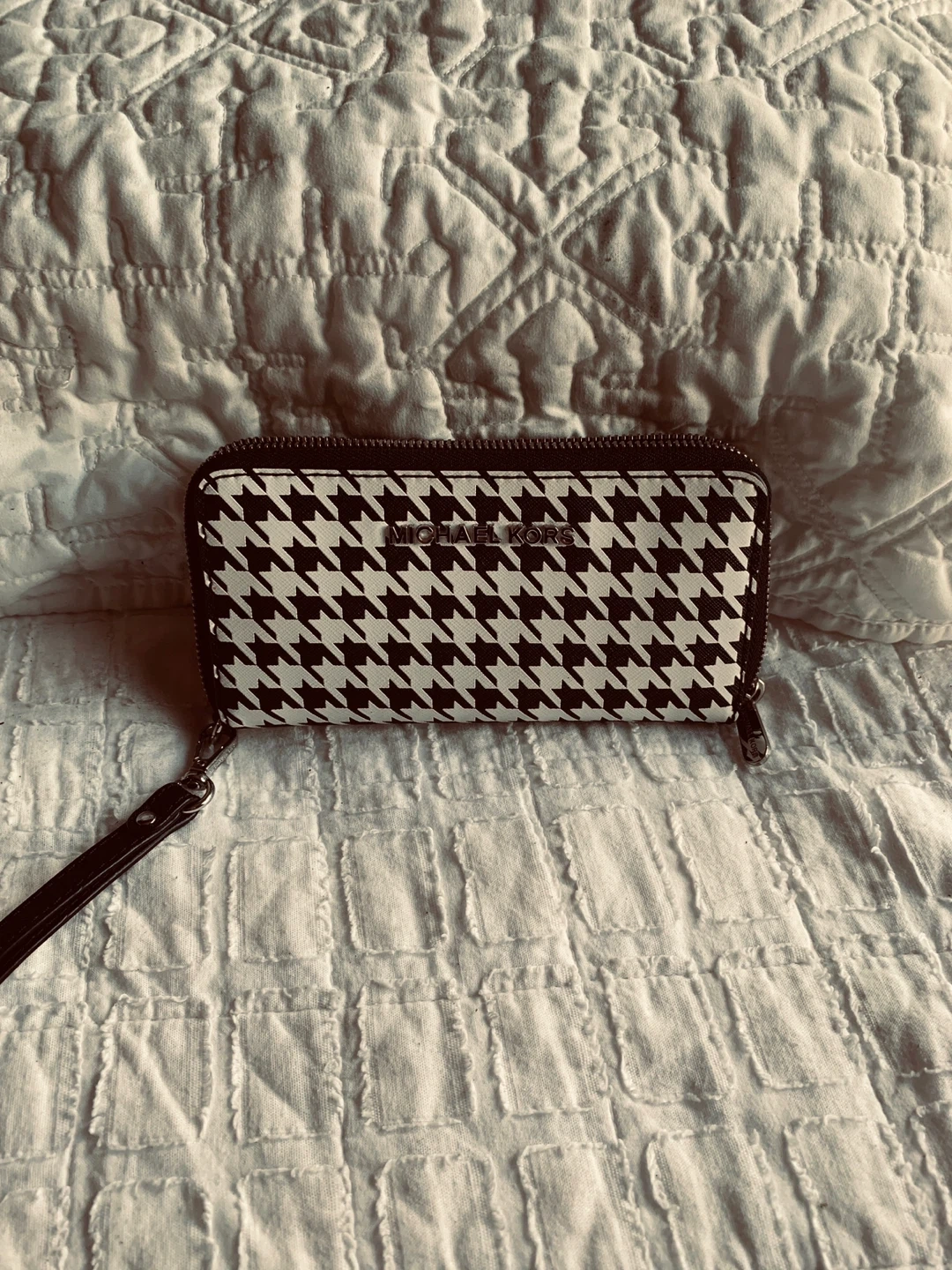 Selling a Michael Kors wallet with a houndstooth pattern. It's in great condition and ready for a new home! It features a zip-around closure and a convenient wrist strap.
