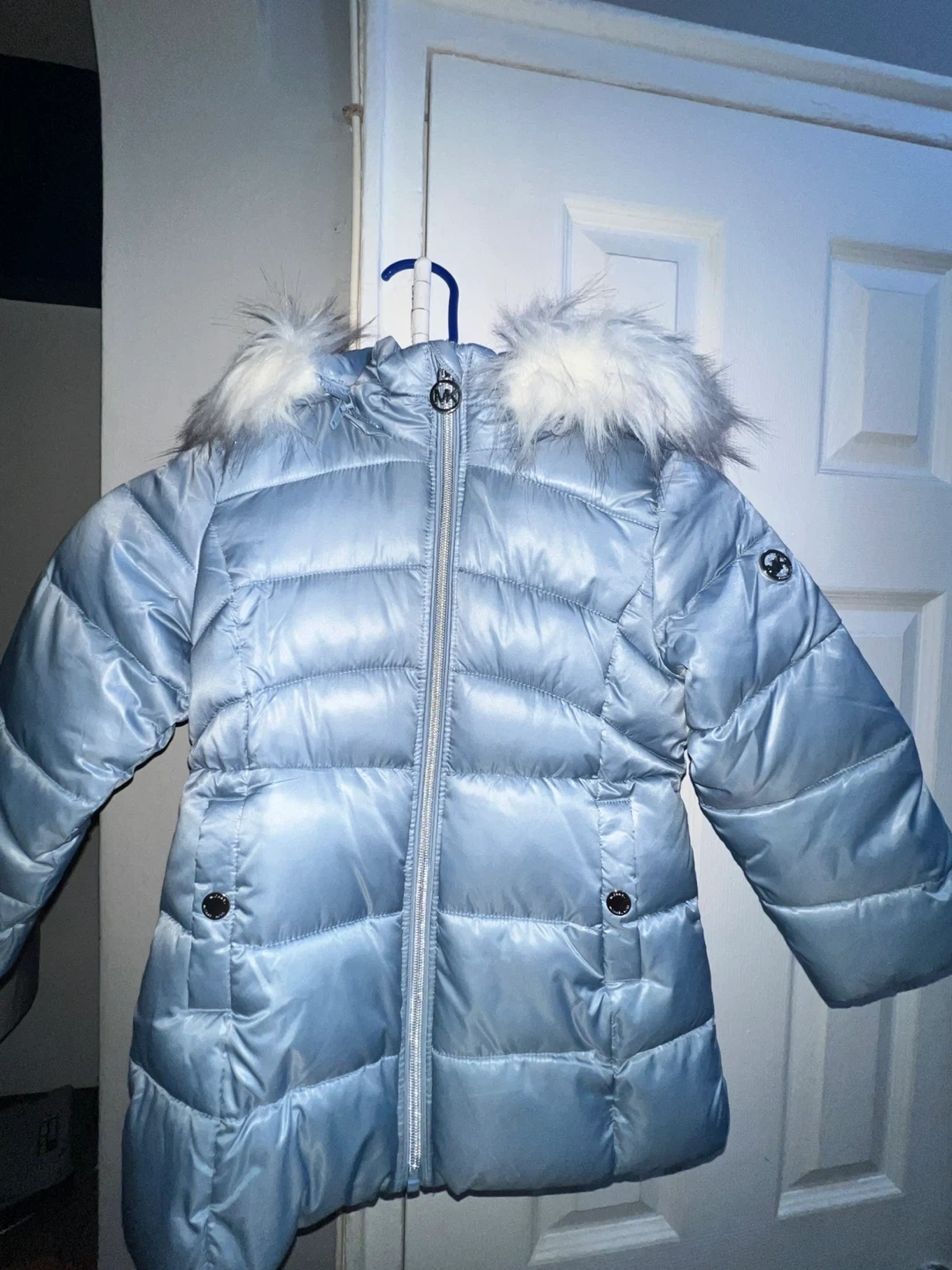 Here's a Michael Kors puffer jacket for kids! It's a size 5/6 and features a stylish design with a faux fur-trimmed hood. Perfect for keeping your little one warm and fashionable during the colder months