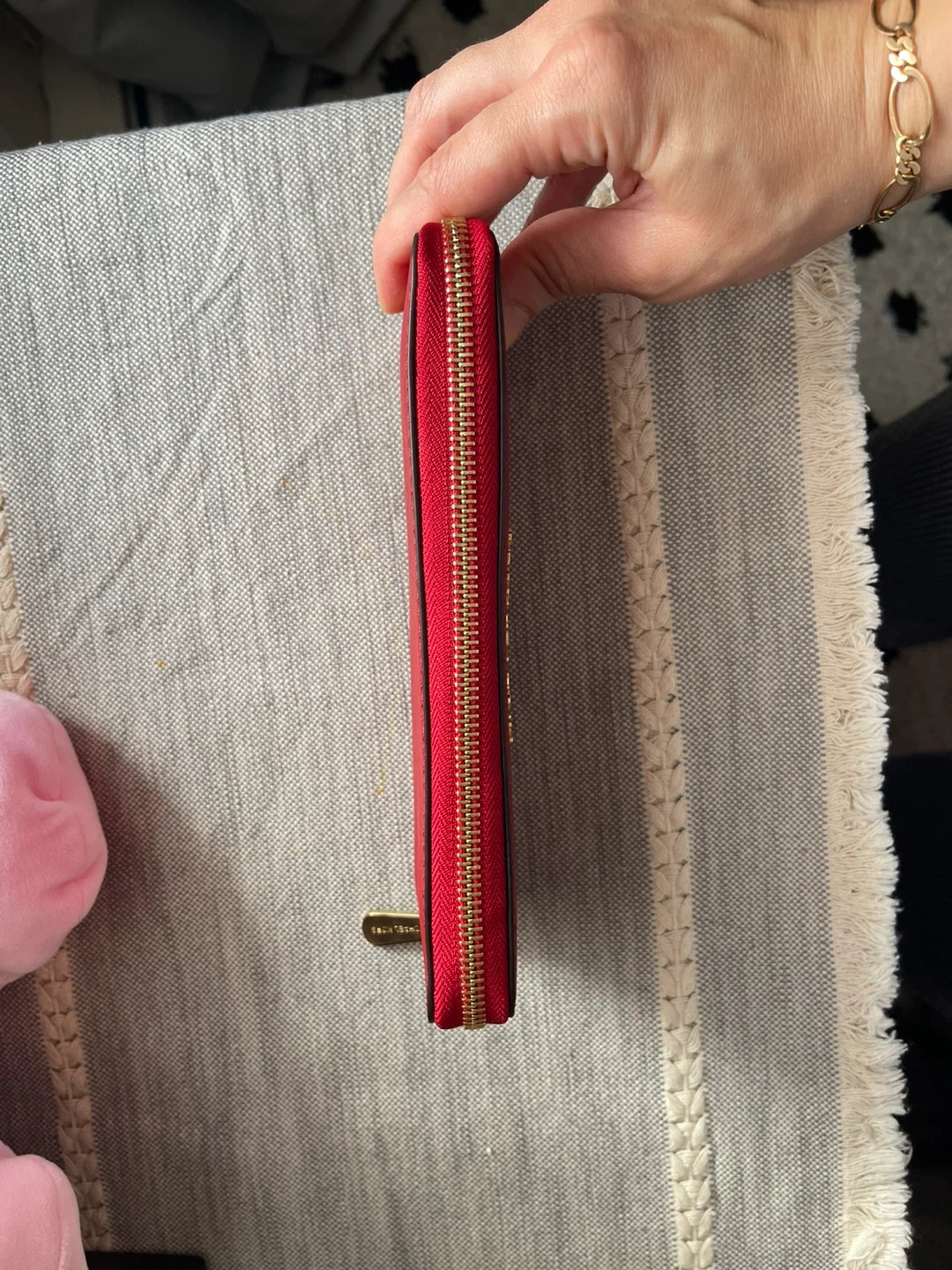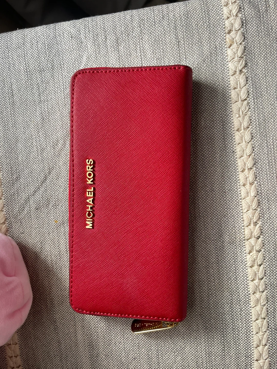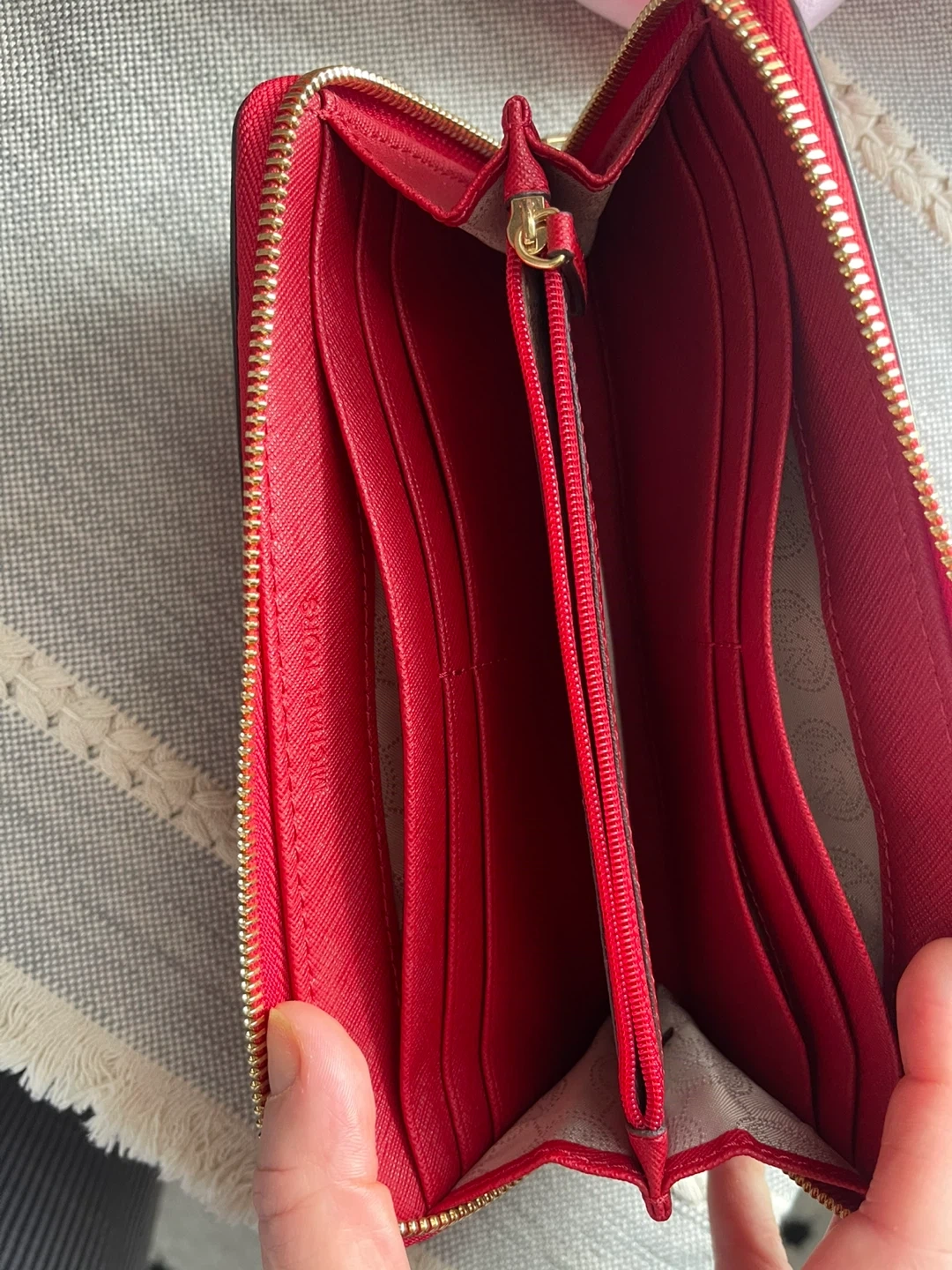 Selling a stylish Michael Kors wallet in a vibrant red color! It's made of leather and features a zip-around closure. Inside, there are plenty of compartments for cards and cash. It's in great condition and ready for a new home