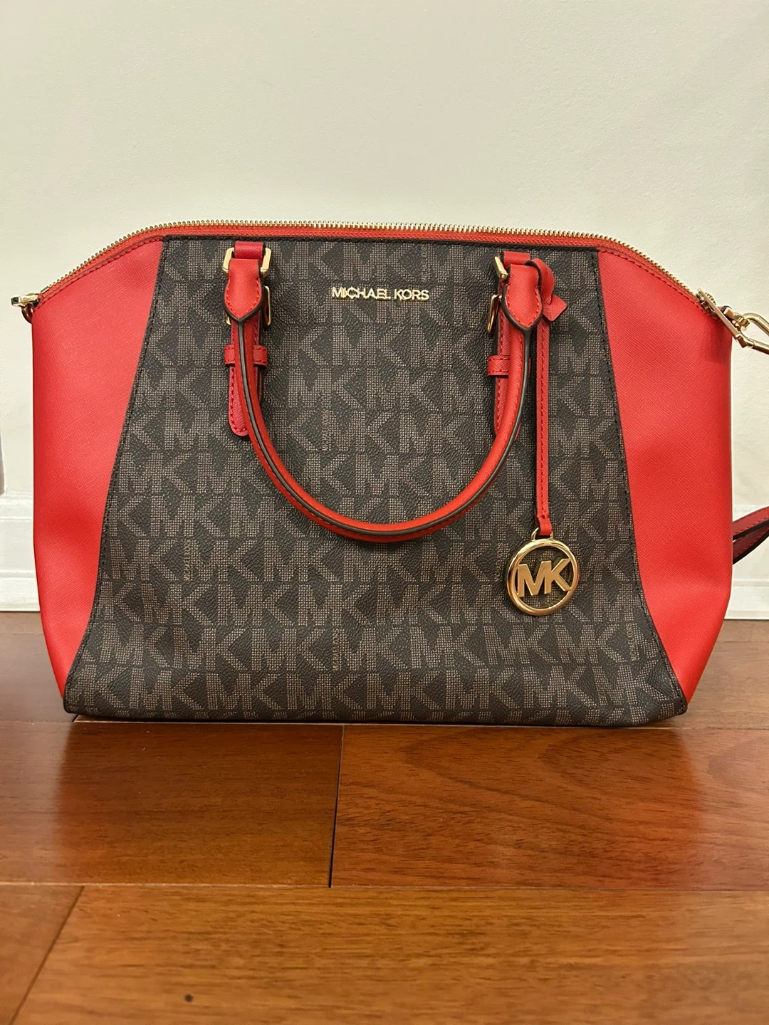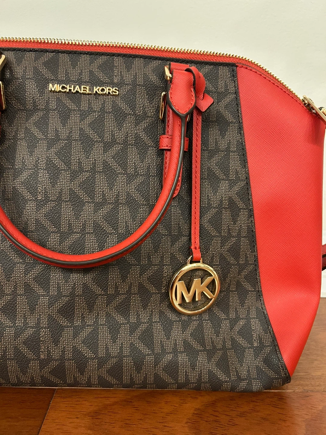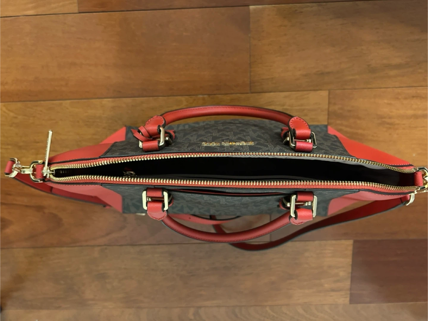 28Selling a Michael Kors satchel in a stylish brown and red color combination. New! Never used. Perfect for everyday use or a night out
