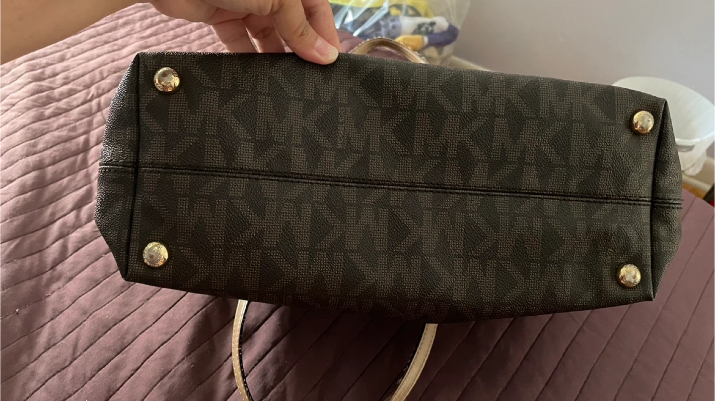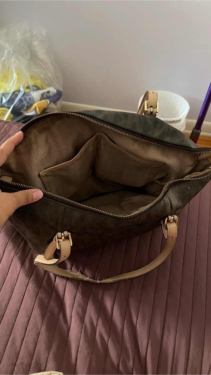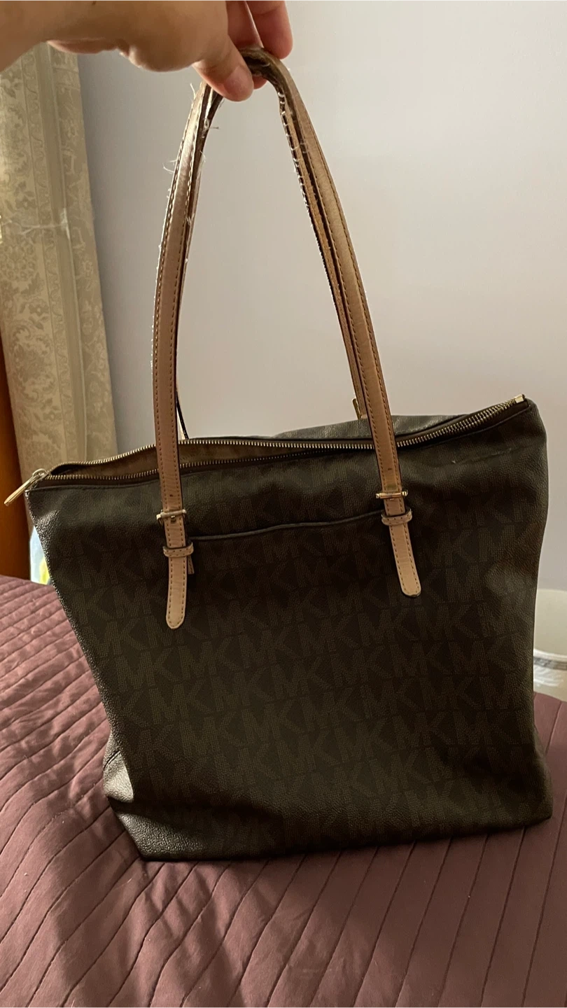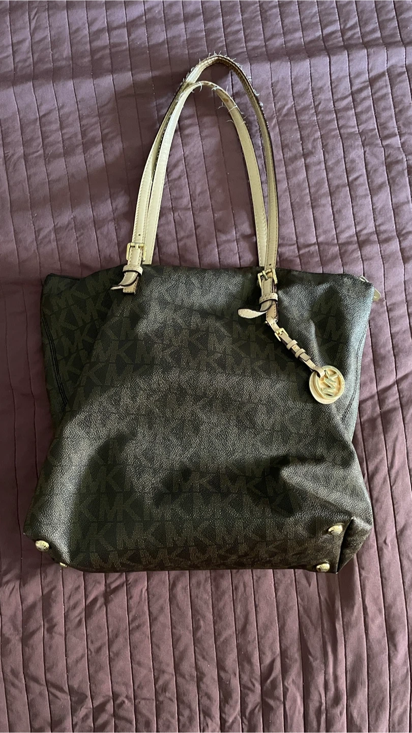 Michael Kors tote bag. It's in used condition with some wear on the handles. It features the classic MK logo pattern. Genuine leather.