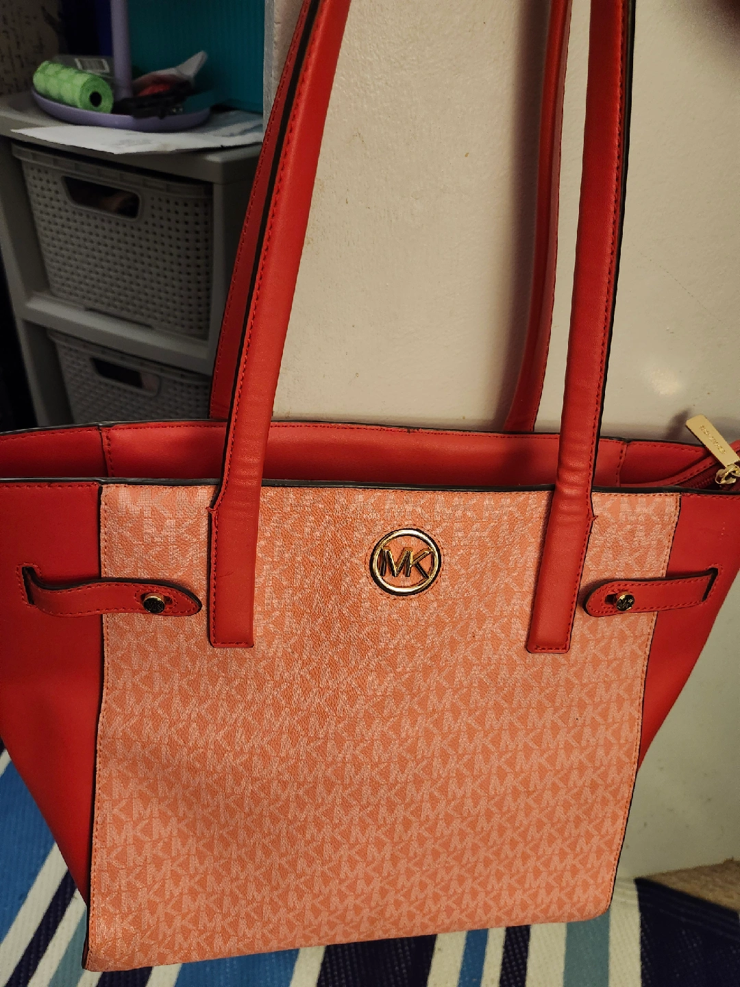 Selling a Michael Kors tote bag in coral and red. It's in great condition and ready for a new home! The bag features the MK logo pattern on the front and has red handles and trim. Perfect for everyday use