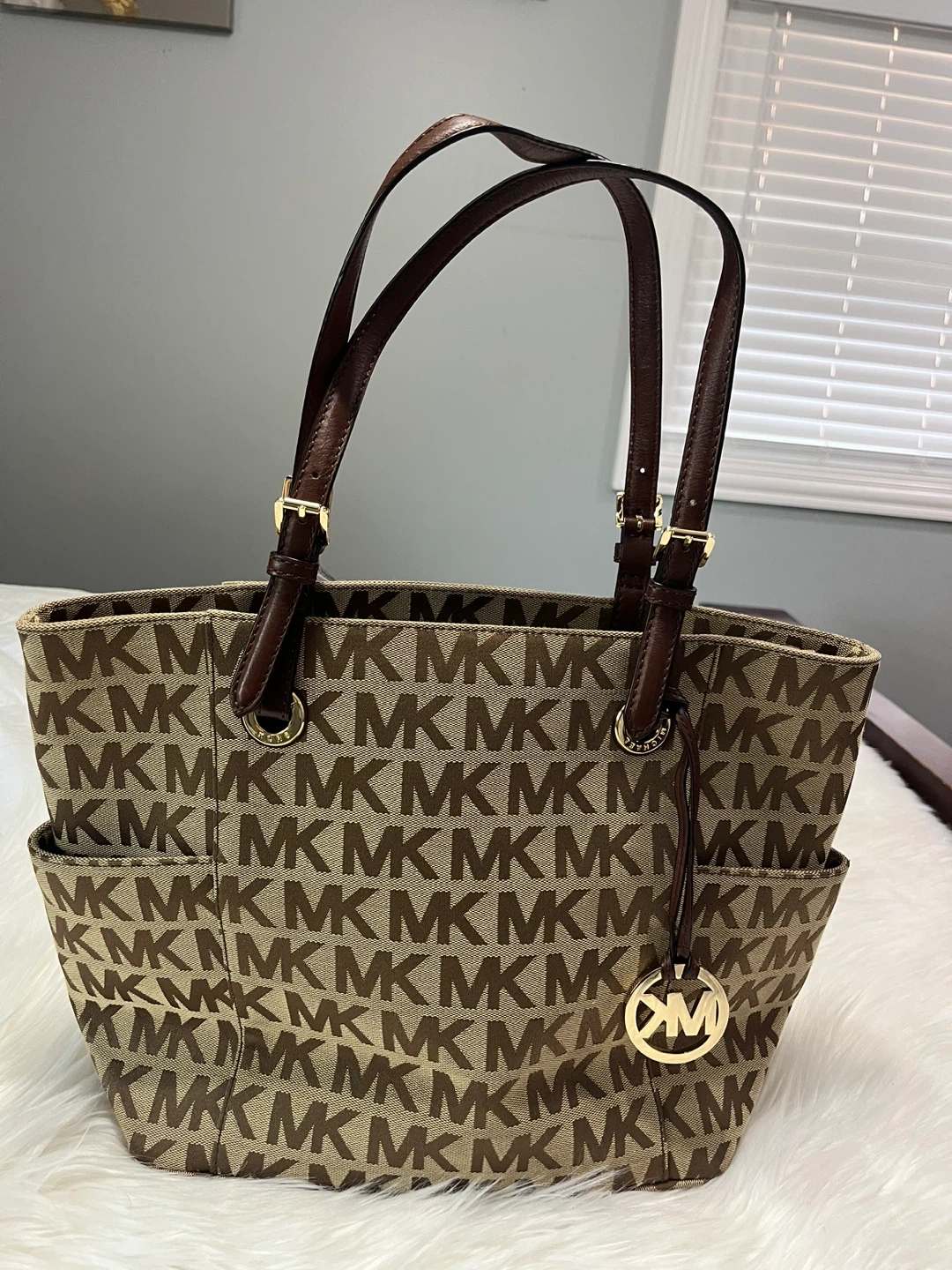 Gently used Michael Kors tote bag with the classic MK logo pattern. It's in great condition and has plenty of room inside for all your essentials. Perfect for everyday use!
