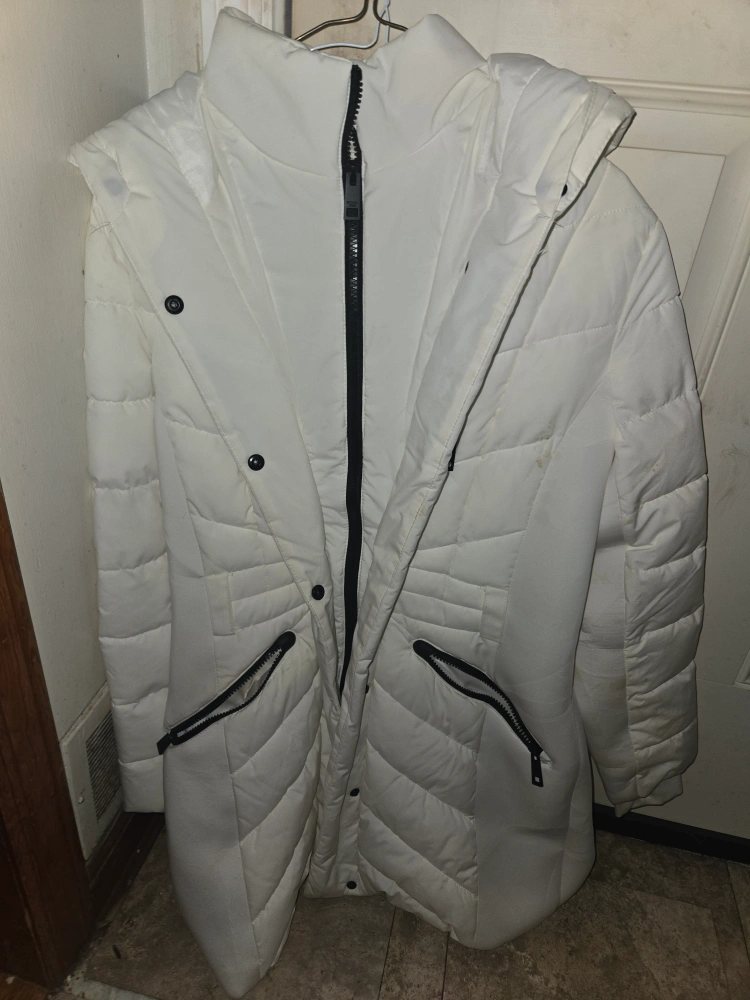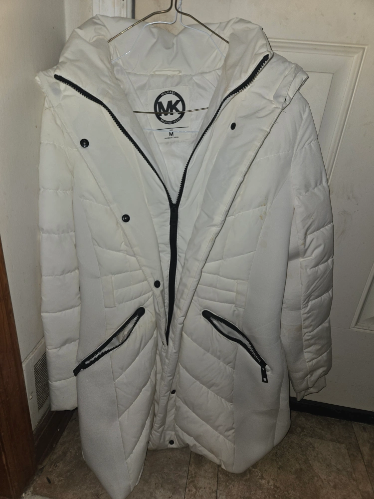 Selling a Michael Kors puffer coat in white. It's a size medium and has a stylish design with black accents. Perfect for staying warm and fashionable!