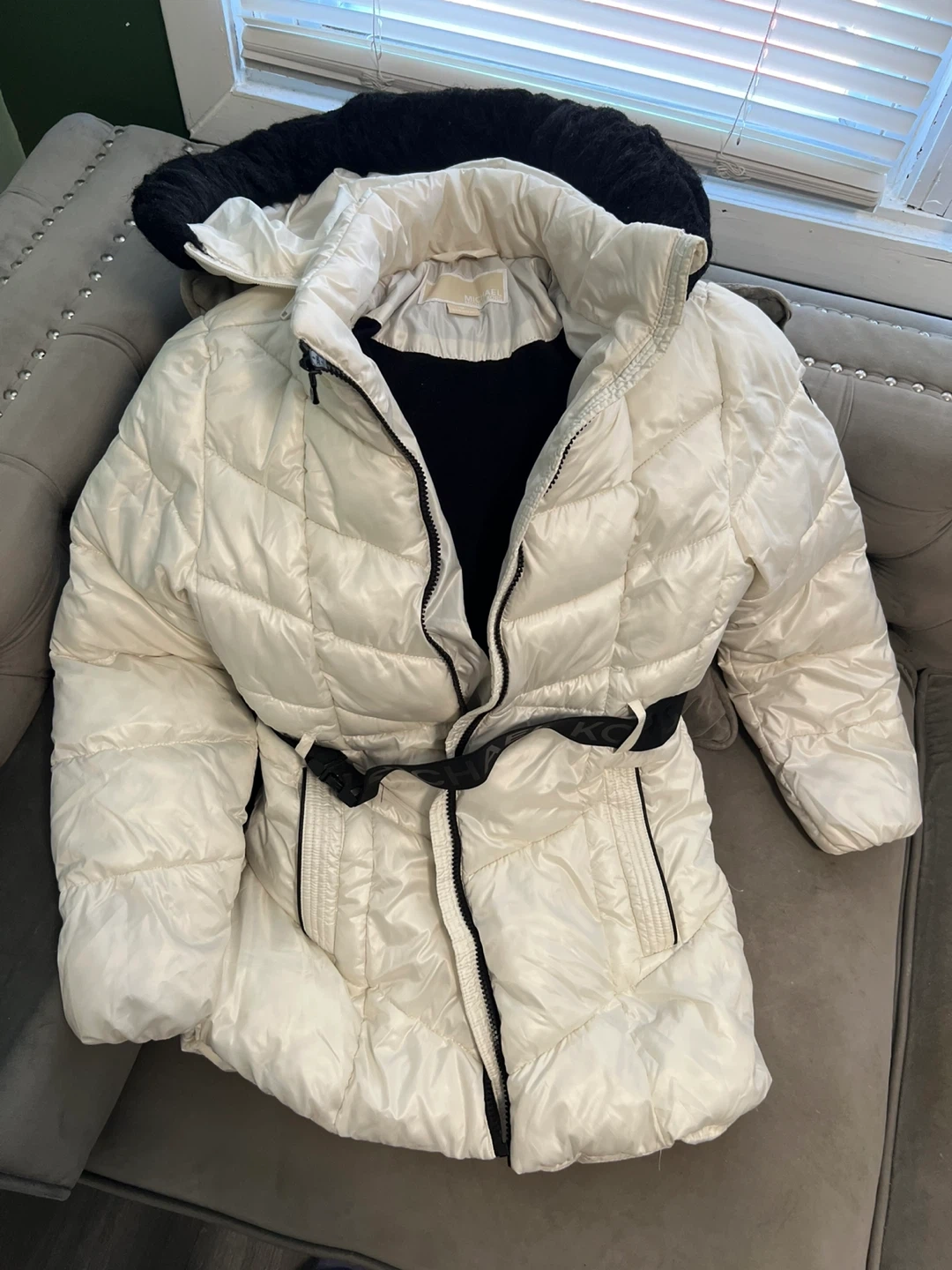 5Selling a Michael Kors white puffer coat! It has a black knitted hood and a belt. Perfect for cold weather!