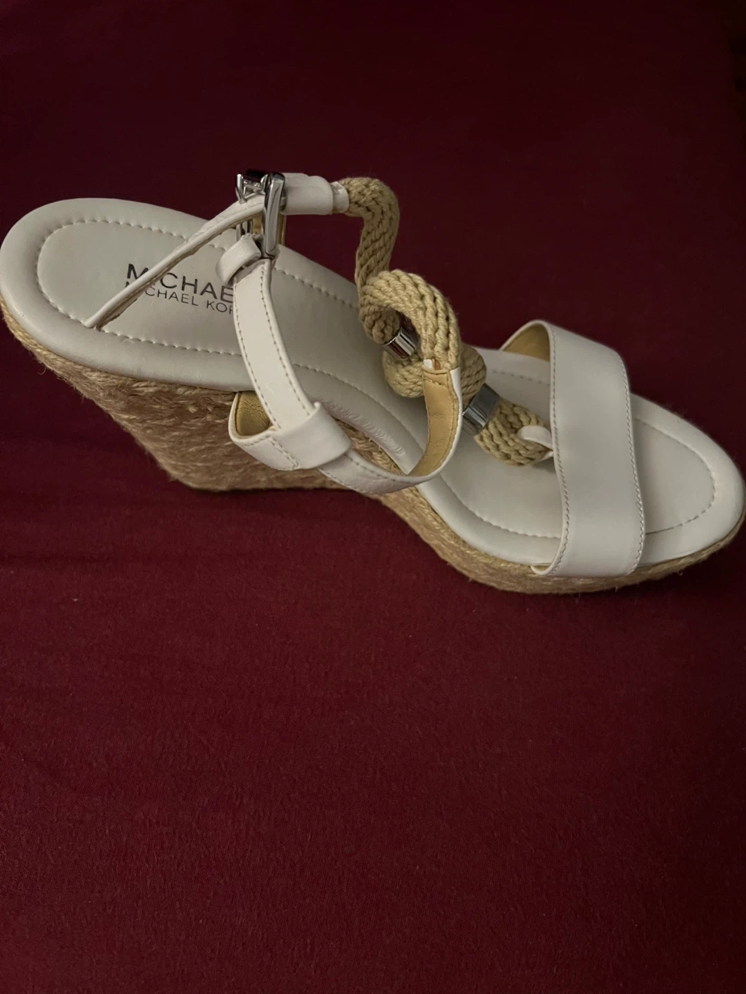72Selling a pair of Michael Kors white wedge sandals. They feature a rope-style accent and are in good condition. Perfect for summer!