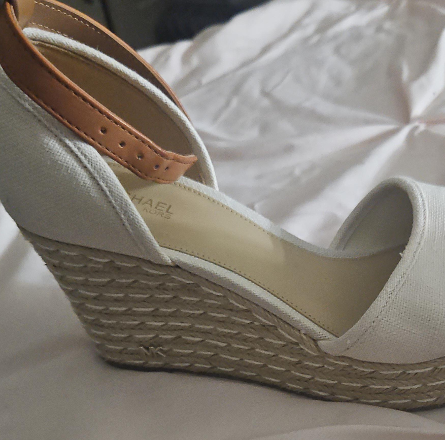 Selling a pair of Michael Kors wedge sandals. They feature a white canvas upper, a tan ankle strap, and a woven wedge heel. Great for summer!