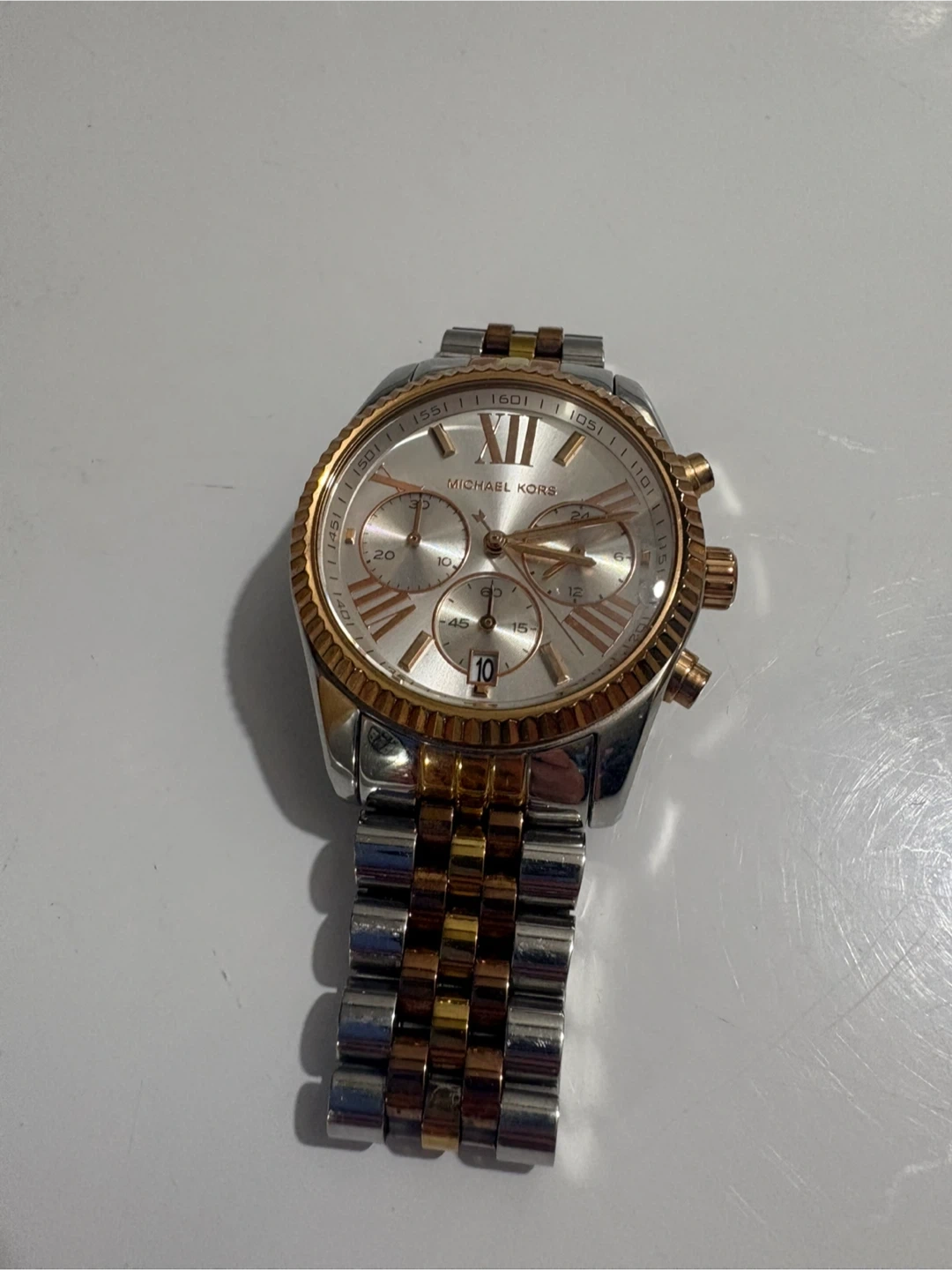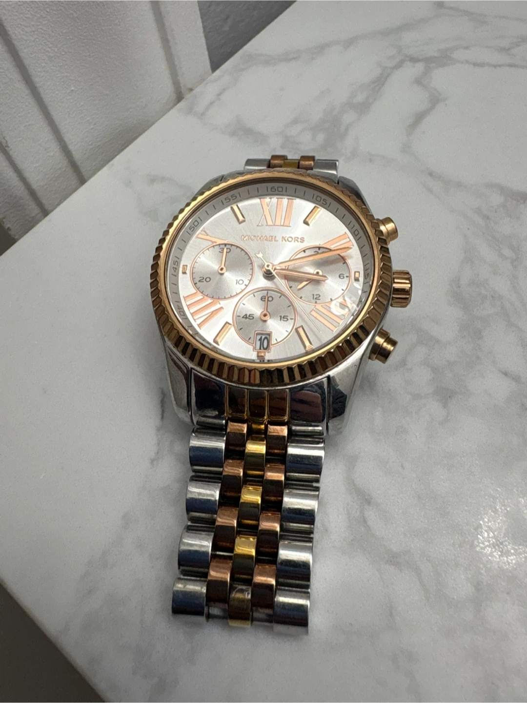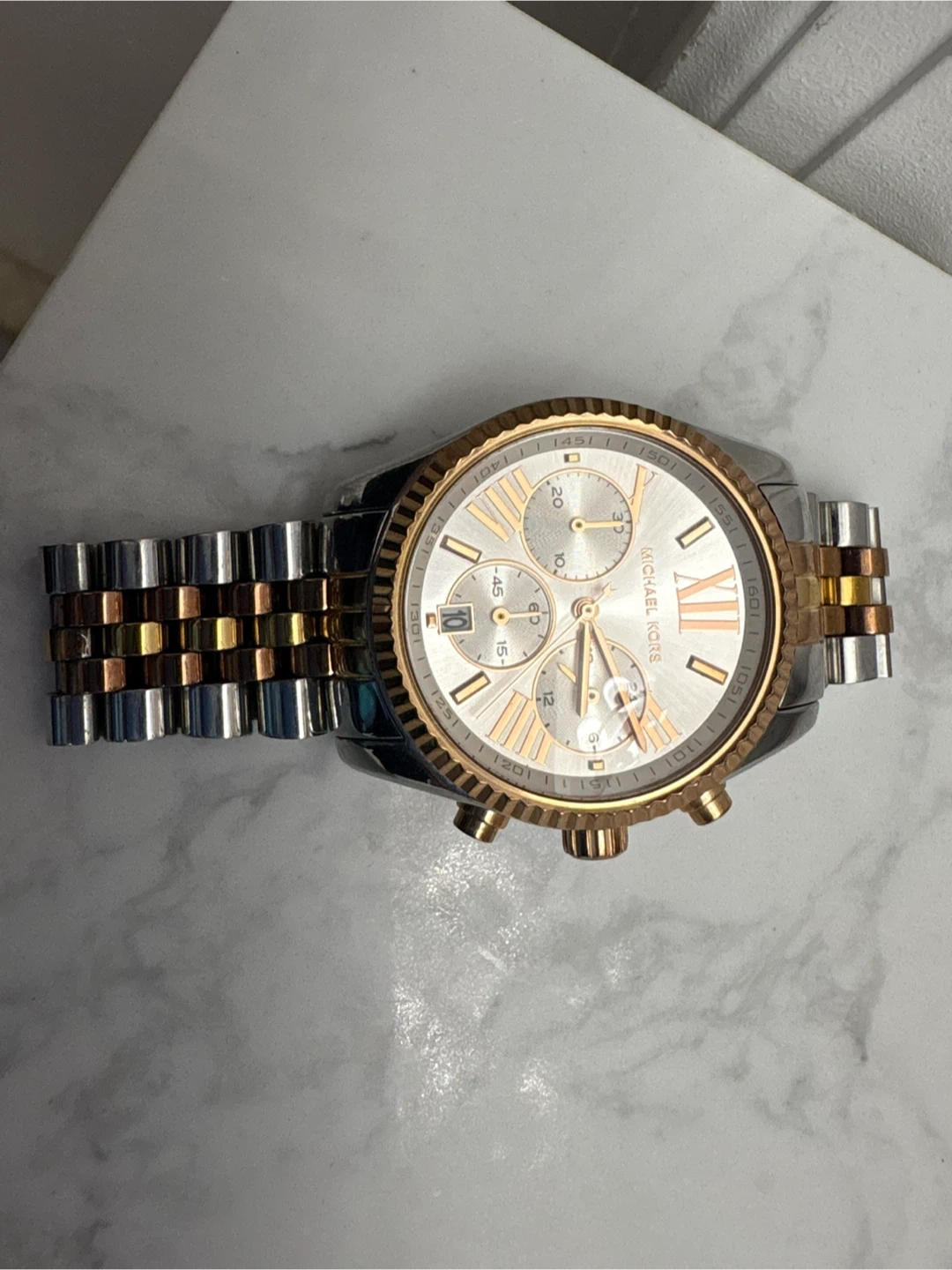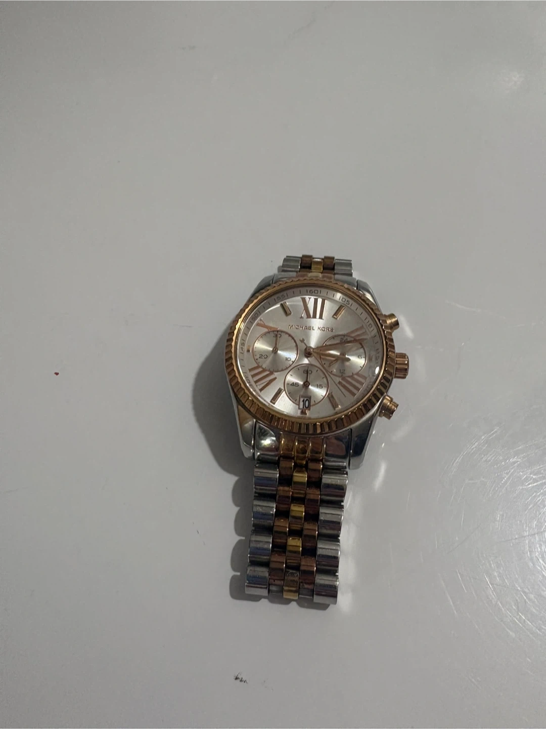 Selling a Michael Kors women's watch. It features a silver and gold-tone band and a chronograph dial. The watch is in good condition and ready for a new owner!
