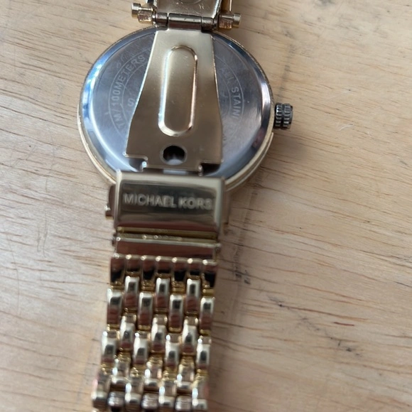Selling a women's Michael Kors watch. It has a date display and a crystal-set bezel. The watch is in good condition and ready for a new owner! The only issue its missing the pin that turns the dial. can be replaced. selling as is