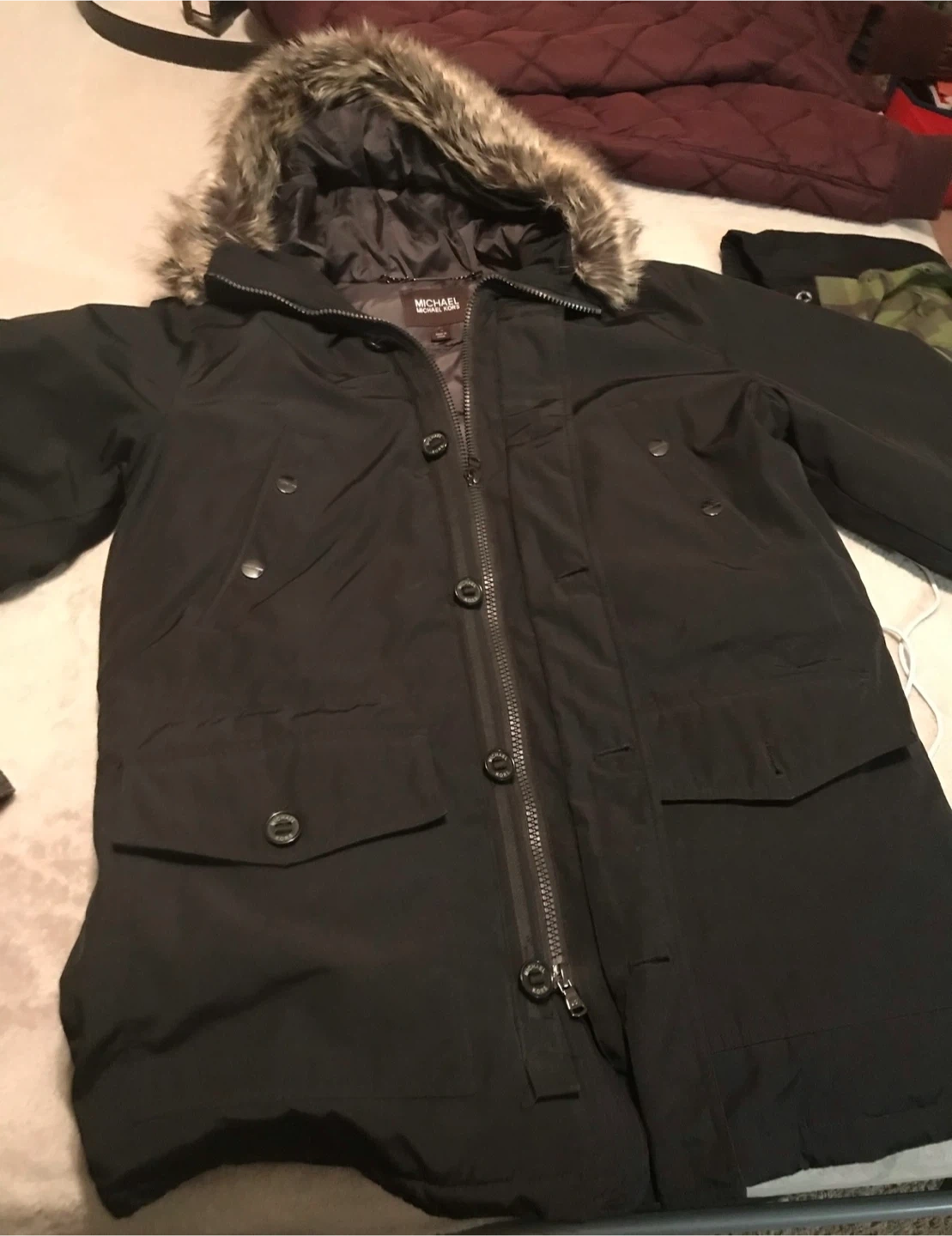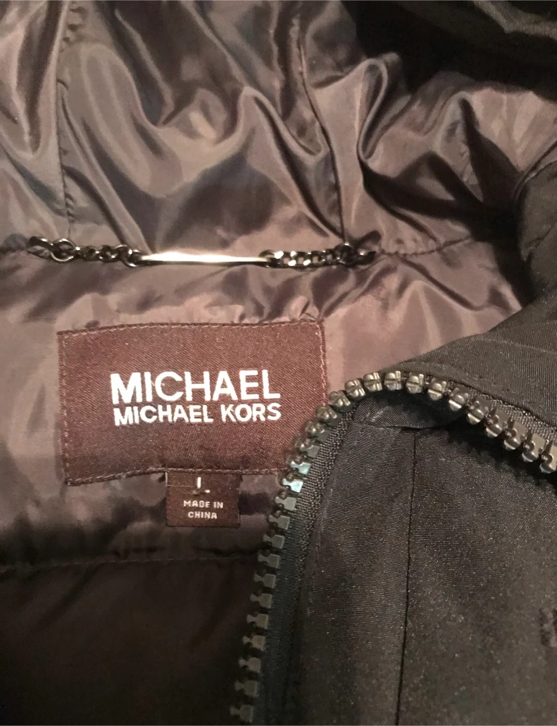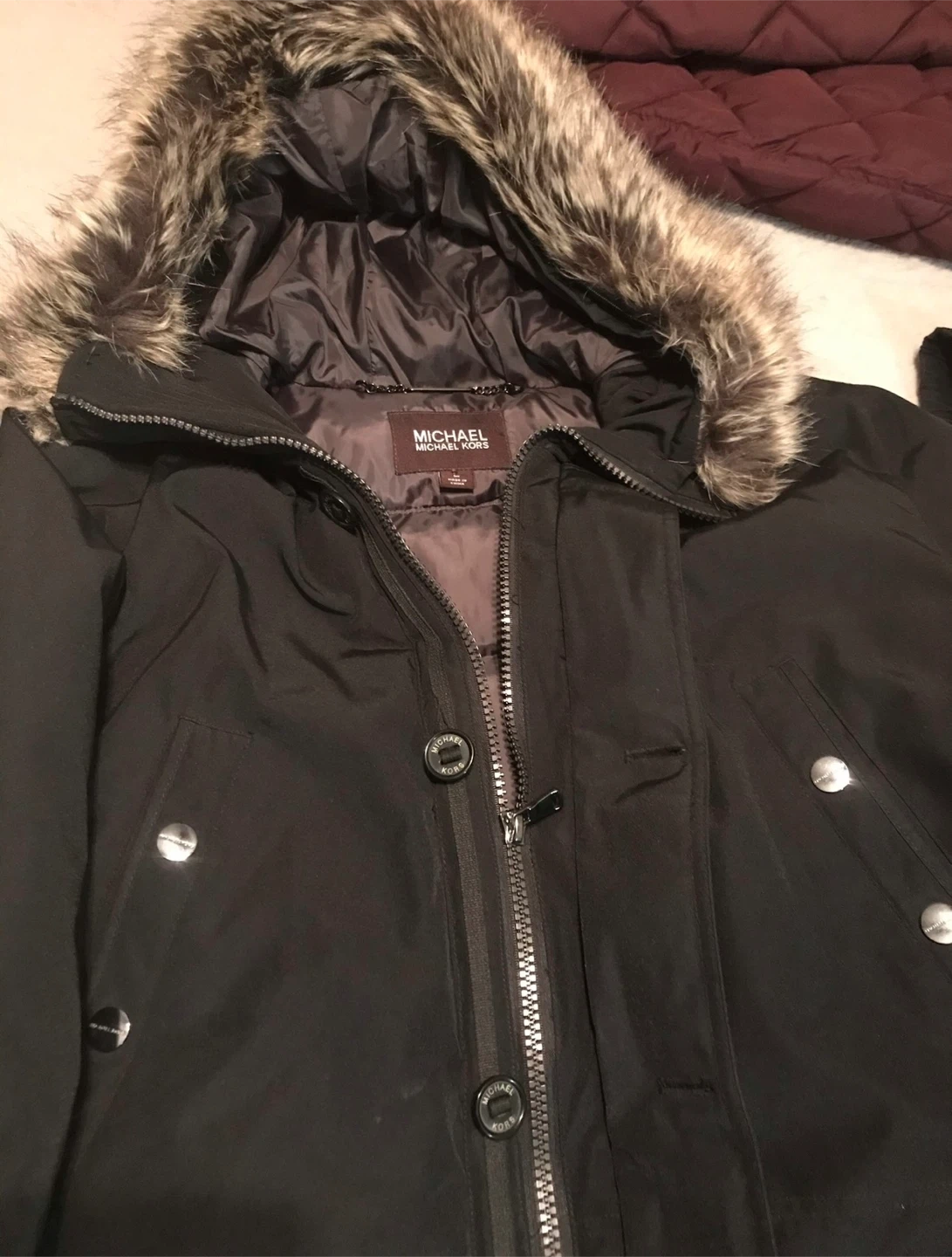 Selling a Michael Kors winter parka in black. It's a size L and features a faux fur-trimmed hood. Perfect for staying warm this winter!