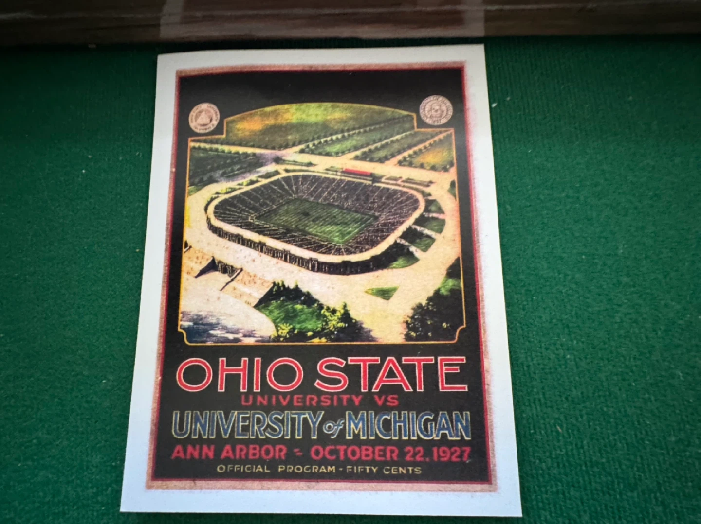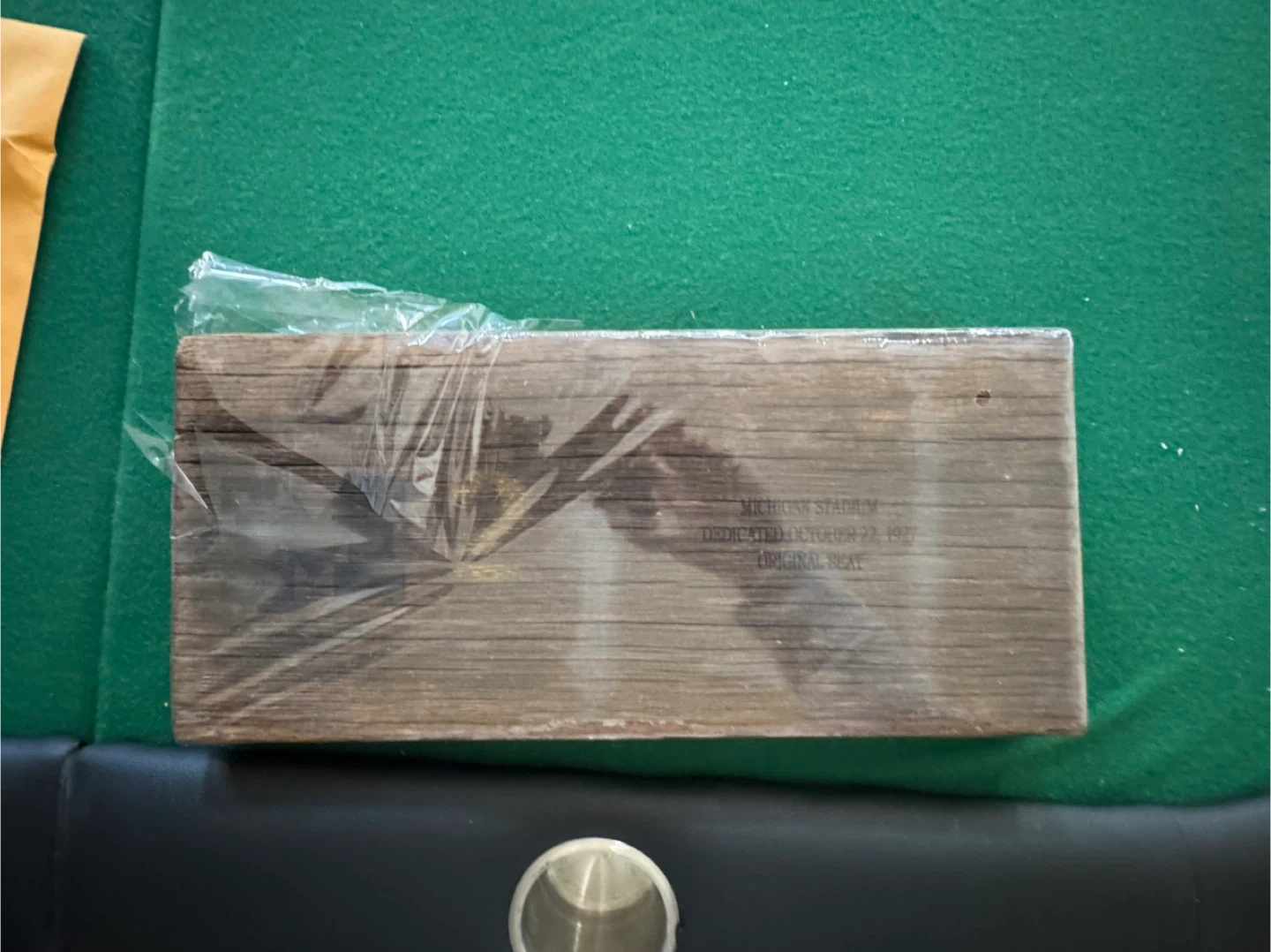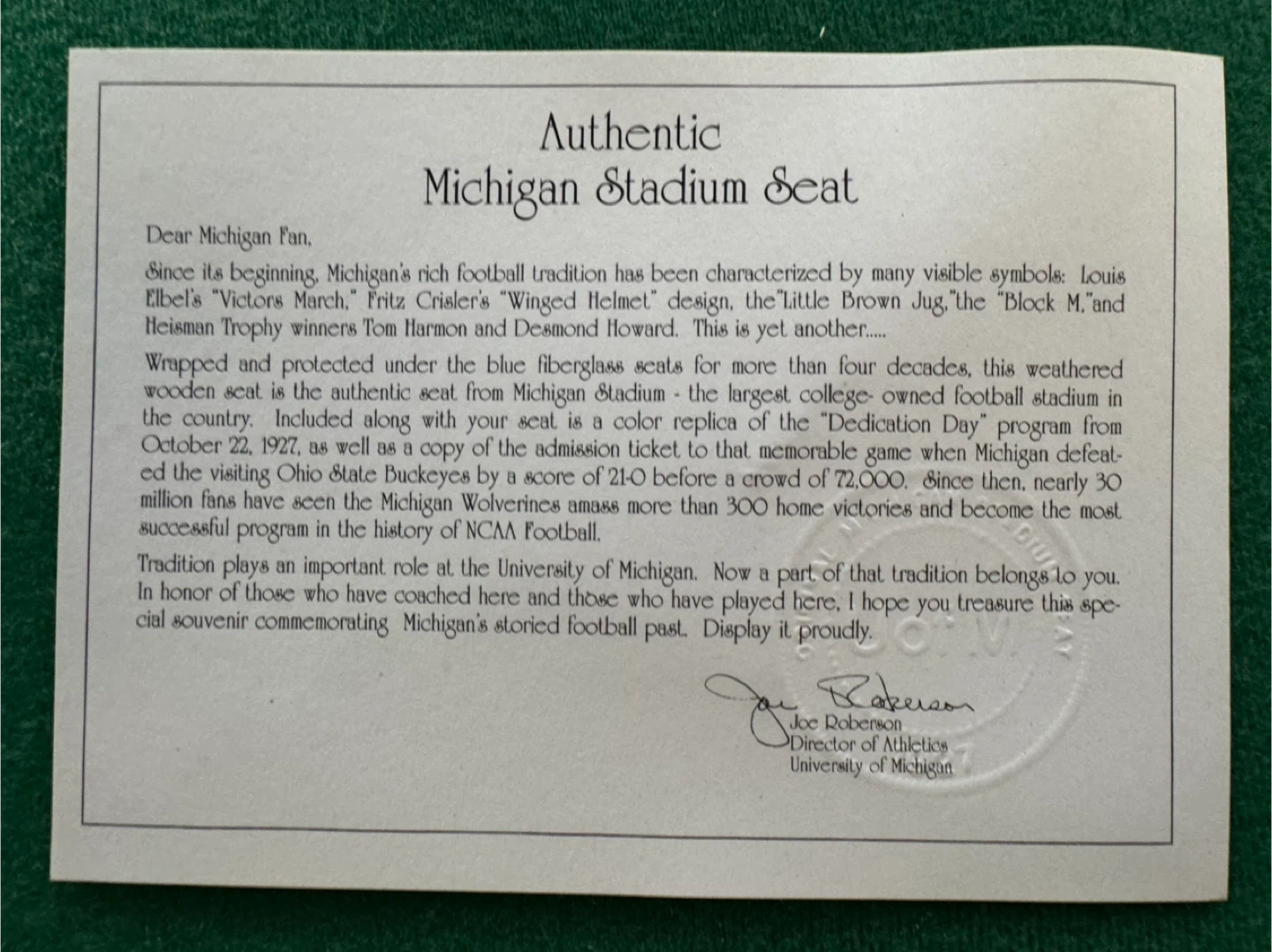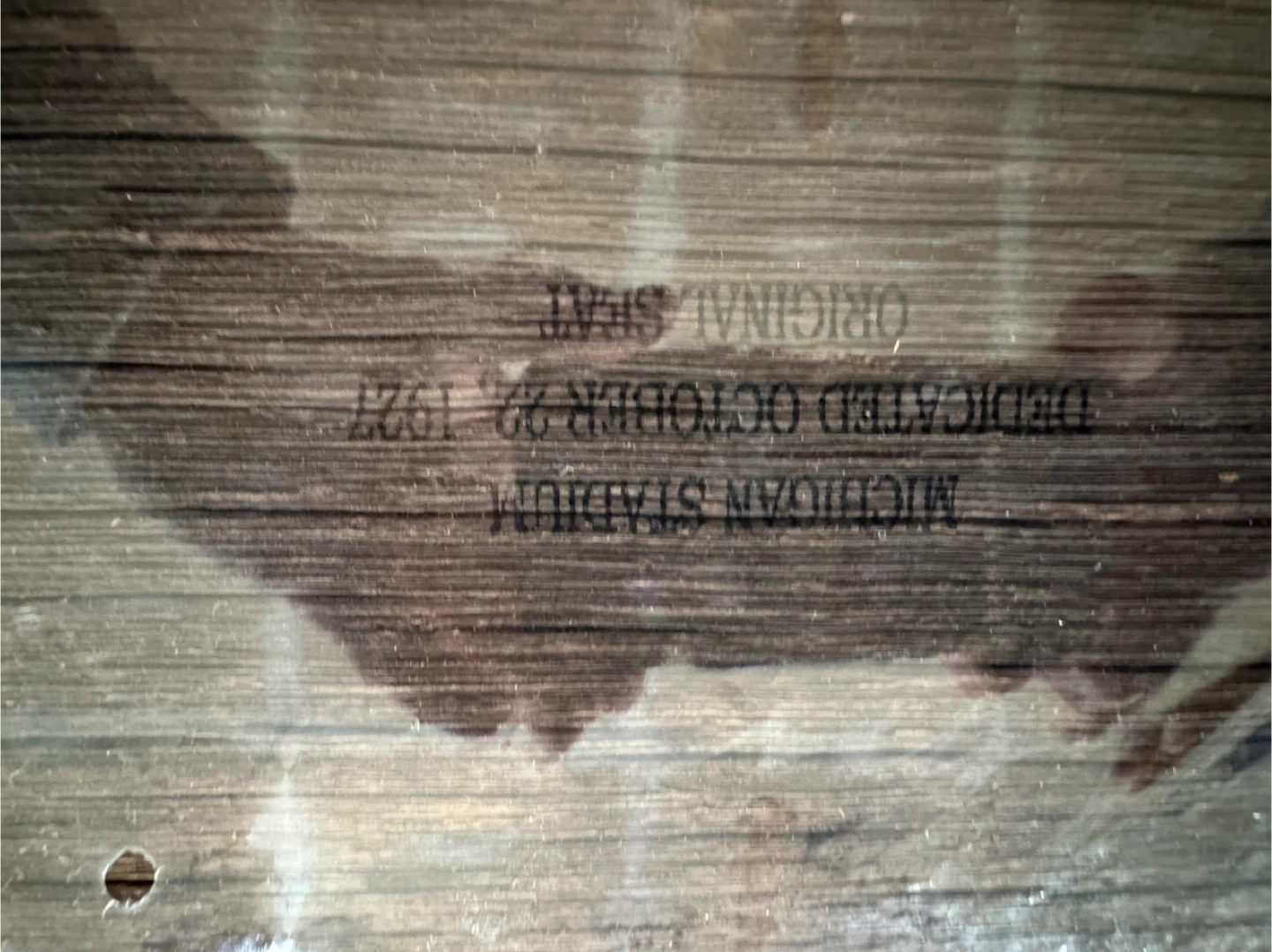Authentic Michigan Stadium seat dedicated October 22, 1927. This weathered wooden seat is the authentic seat from Michigan Stadium. Included along with your seat is a color replica of the 'Dedication Day' program from October 22, 1927, vs the visiting Ohio State Buckeyes.