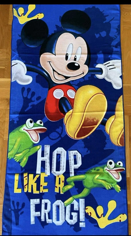 75Here's a fun beach towel featuring Mickey Mouse and some cute frogs! The design says 'Hop Like A Frog!' and it's perfect for kids or anyone who loves Disney new never used it is 27.5x55 inches long
