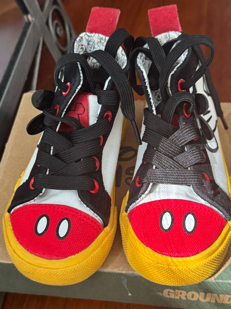 Adorable Mickey Mouse themed sneakers! They feature a fun design with Mickey's face on the toes and classic black laces. Perfect for a Disney fan!