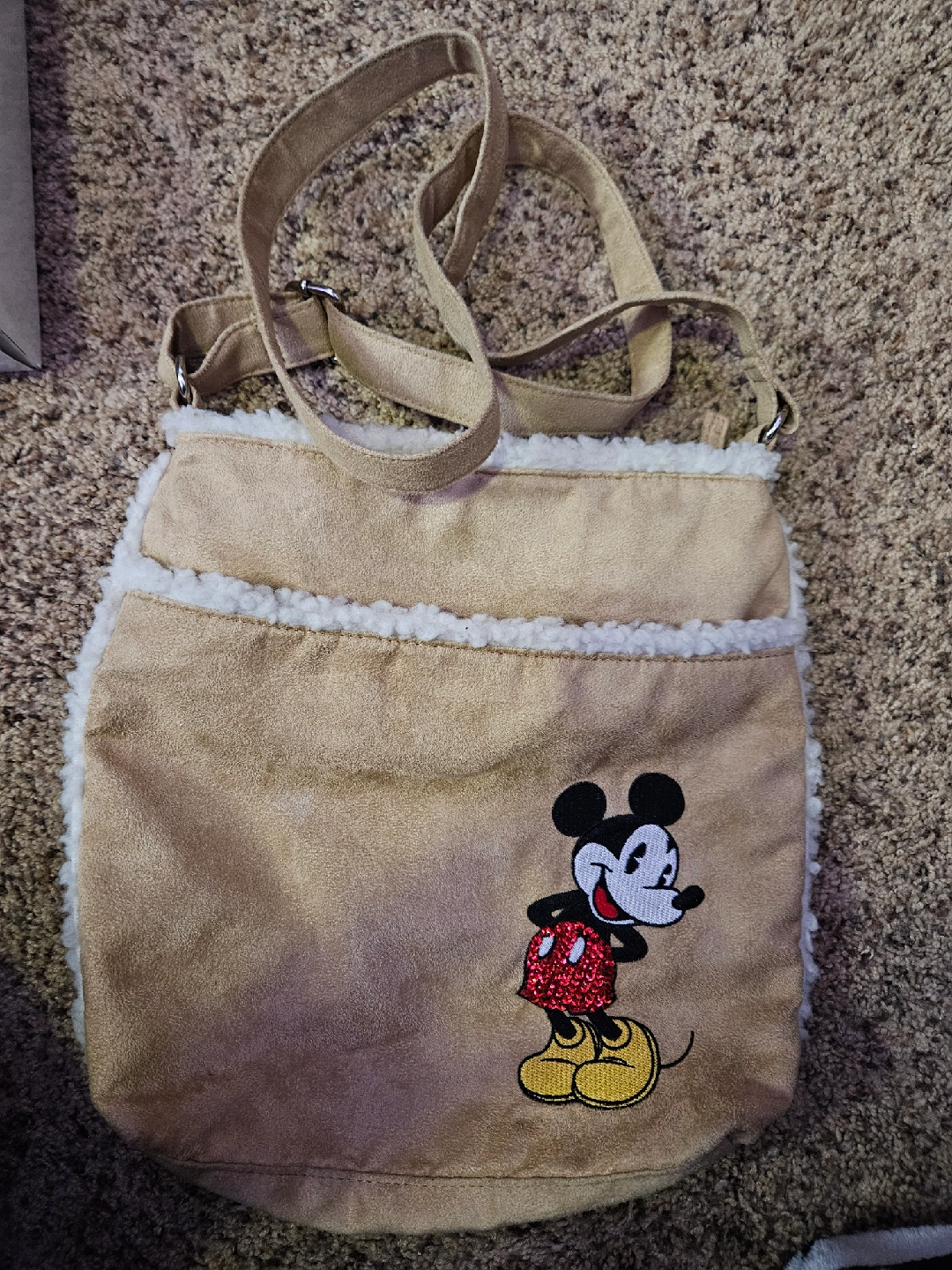 Cute Mickey Mouse shoulder bag in a tan color! It has a soft, furry trim and an adjustable strap. Perfect for carrying your essentials with a touch of Disney magic