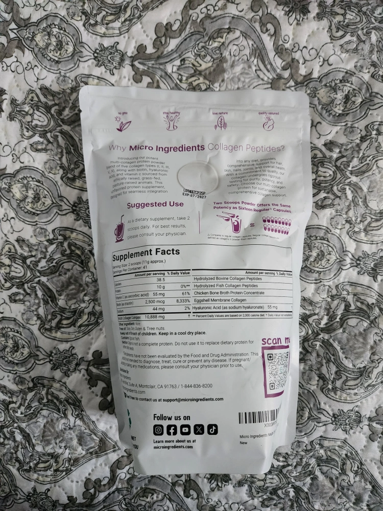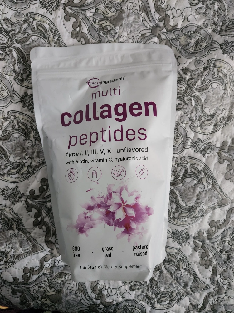 235Selling a bag of Micro Ingredients Multi Collagen Peptides. It's an unflavored blend of type I, II, III, V, X, with biotin, vitamin C, and hyaluronic acid. Each bag contains 1 lb (454 g) of dietary supplement. The expiration date is 2027 July 27, so you have plenty of time to use it!unopened
