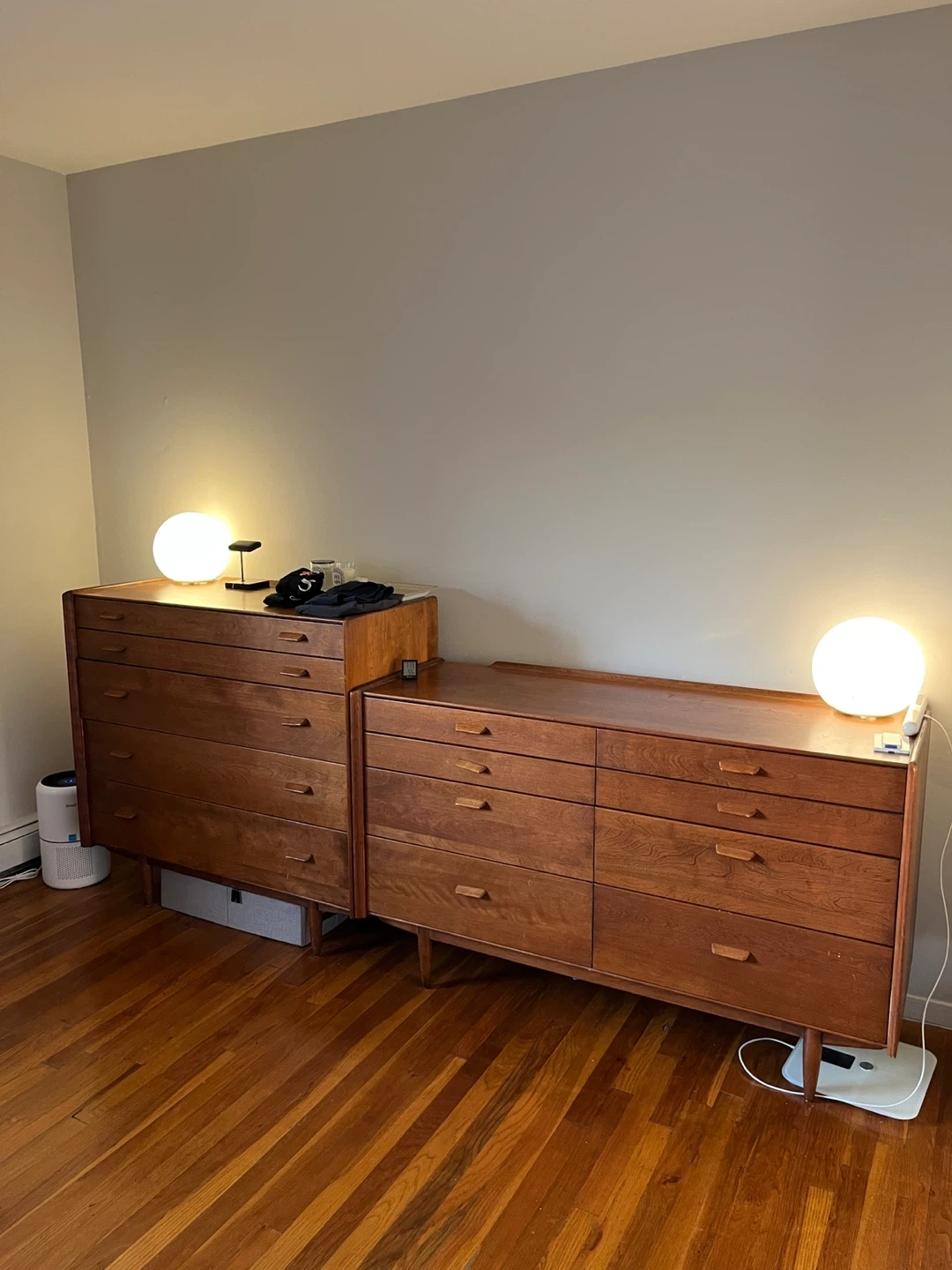 Long Dresser - Russel Wright For Conant Ball 34"H X 54"W X 19"D Tall Dresser - Russel Wright for Conant Ball 40.5"H X 42”W X 19”D These belonged to my grandparents. Russell Wright for Conant Ball Dresser from the Mid 20th Century. Founded in 1853, in Gardner, Massachusetts, the Conant Ball Furniture Company was well known for crafting solid wood furnishings many of which were designed by Russell Wright. The dresser is most likely of Birch wood with a honey brown finish that was popular in the mid 20th century. Both dressers stand on four tapered legs and overall shows some visible signs of wear that are consistent with its vintage usage. Made in the USA. Must be able to pick up and move on your own. $1000 for the set OBO. Pick up is after 6:30PM weekdays. All day weekends.