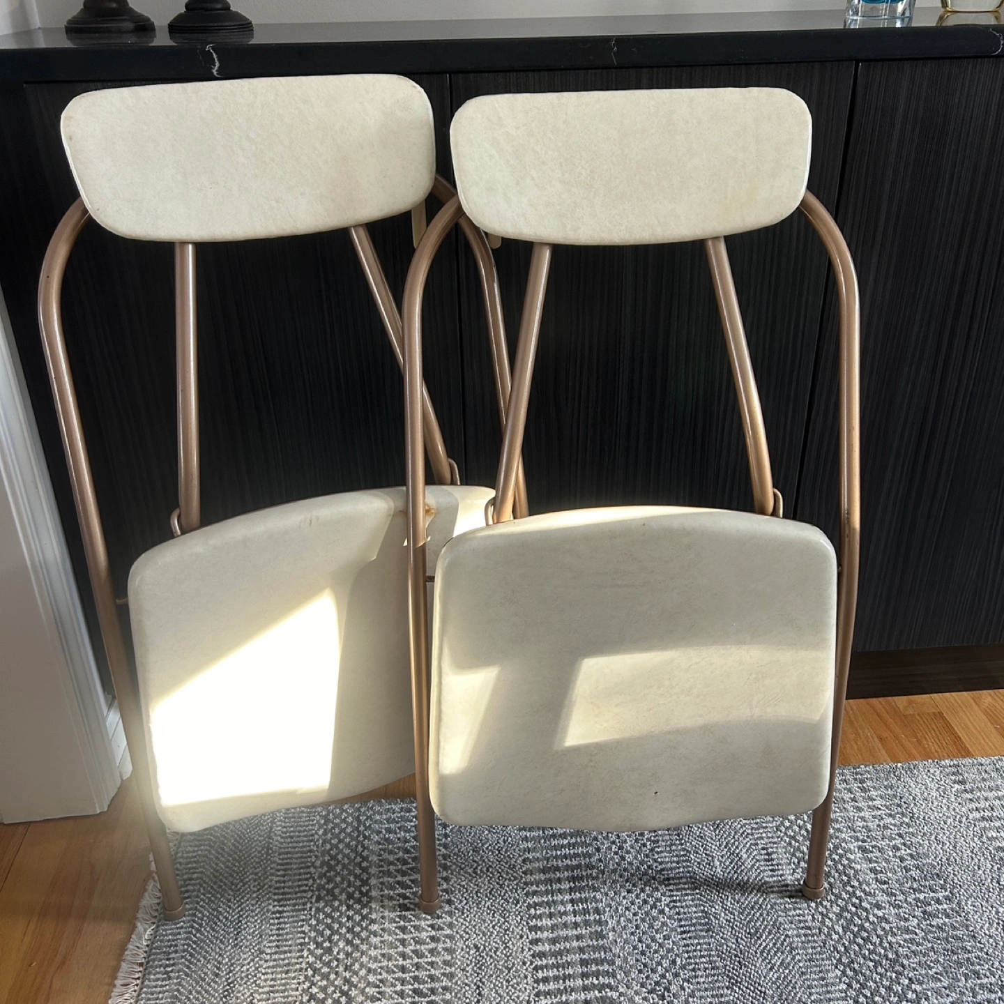 A set of two rare vintage mid century modern atomic folding chairs. Manufactured by Cosco Stylaire Hamilton in Columbus Indiana. The Padded seats and backs are in the hard to find white color. Good working condition. Cash only. Local pickup at public location.
