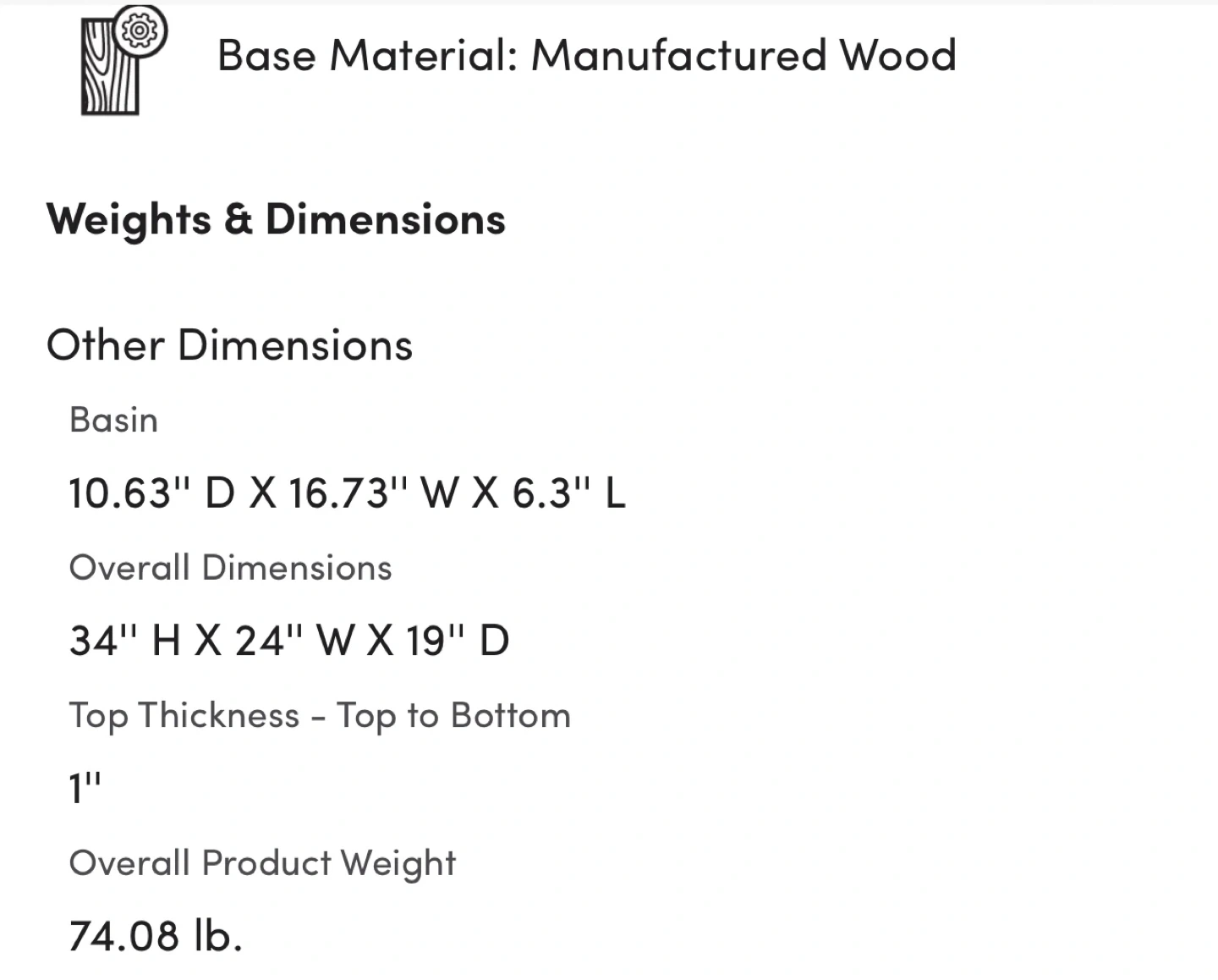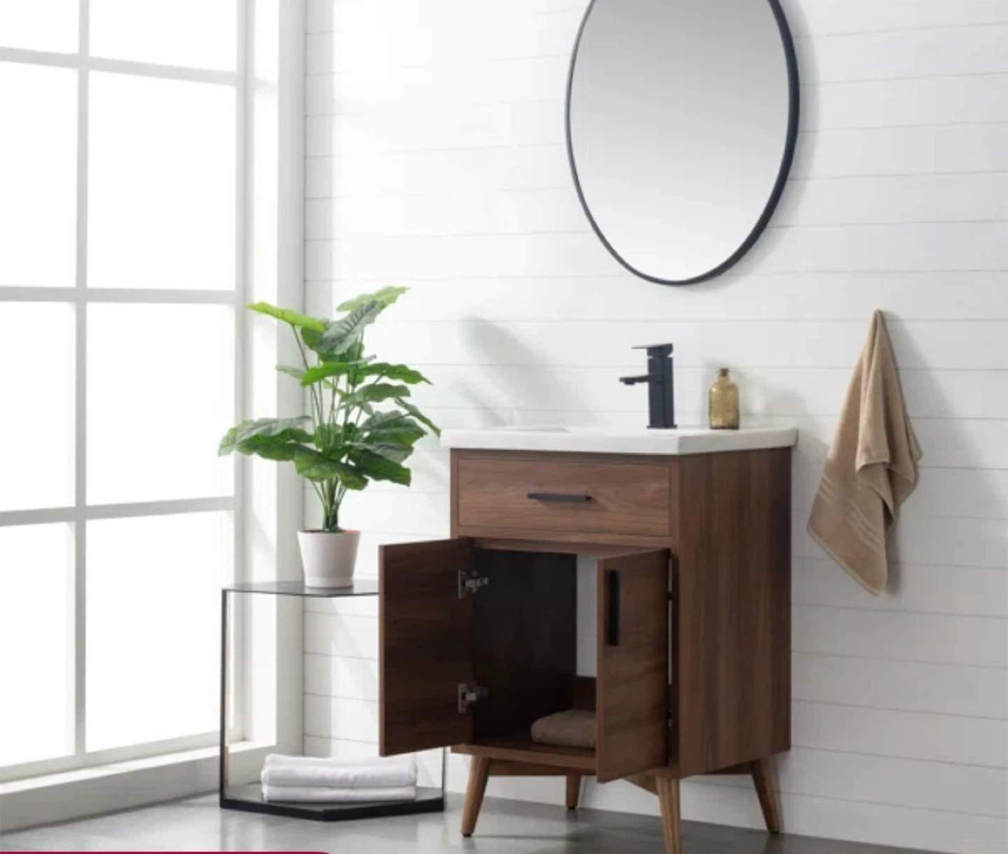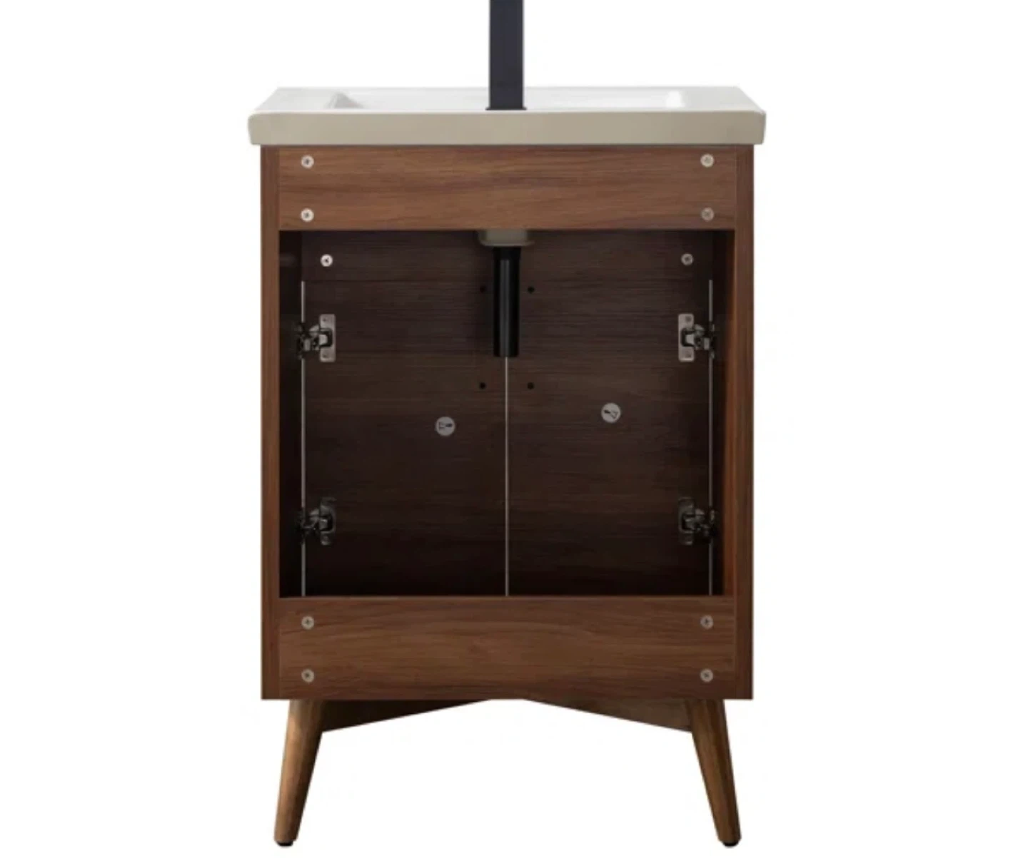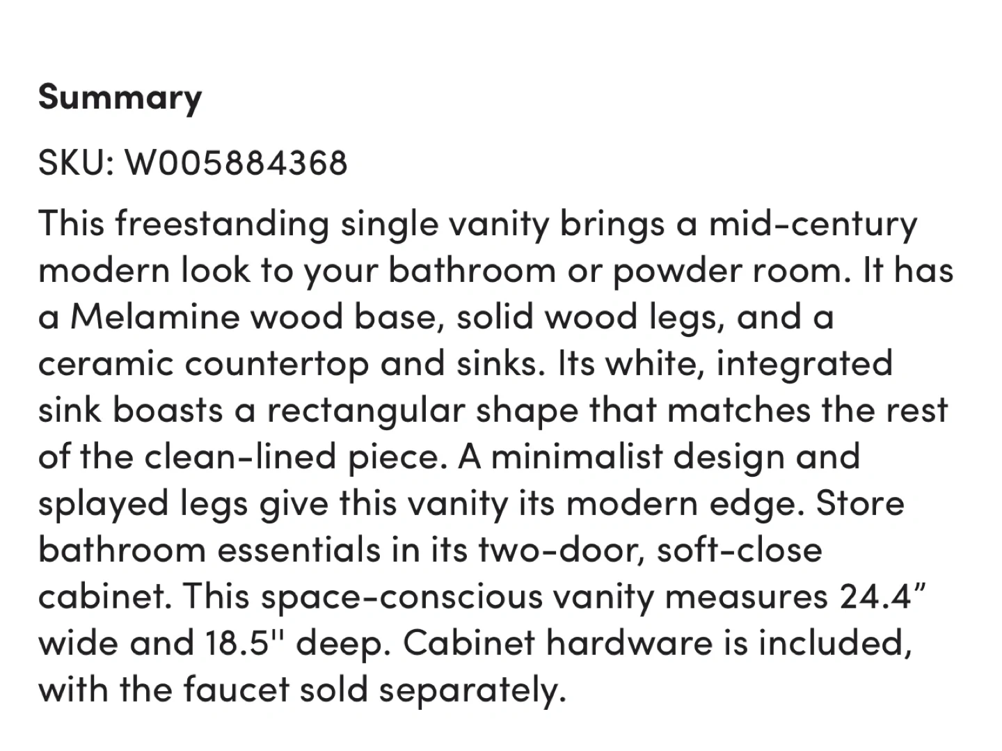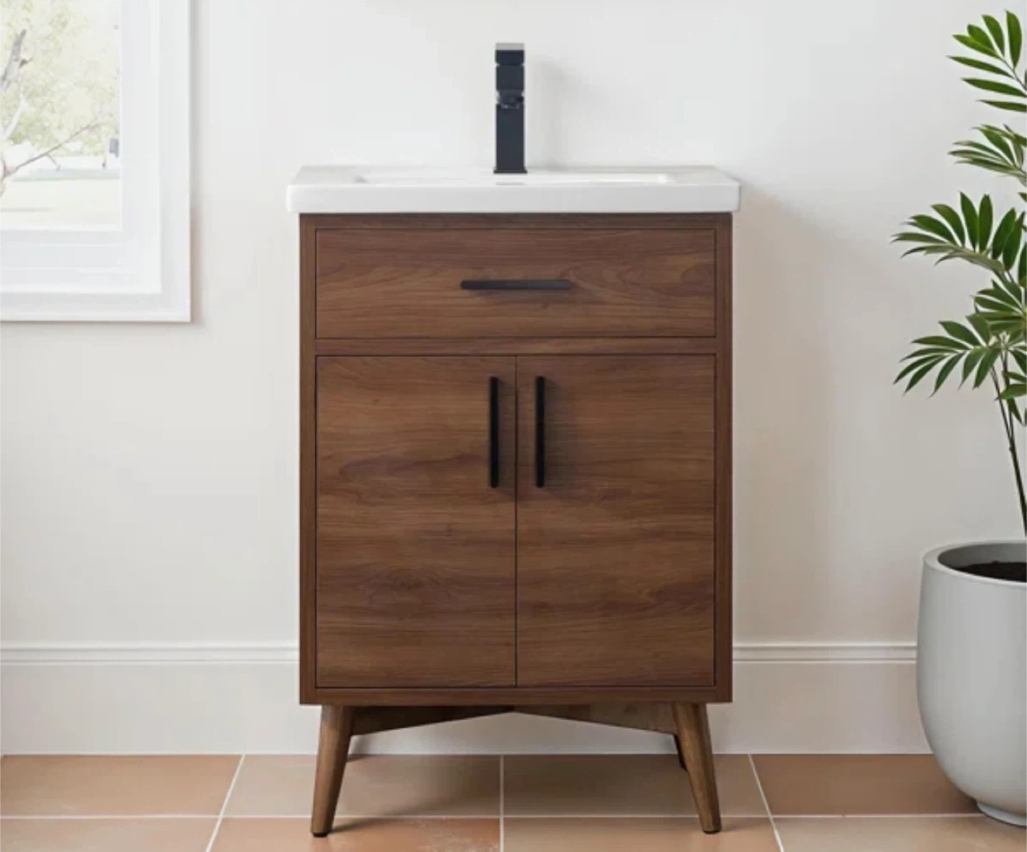 36This freestanding single vanity brings a mid-century modern look to your bathroom or powder room! It features a Melamine wood base and solid wood legs, topped with a ceramic countertop and integrated rectangular sink. The minimalist design and splayed legs give it a modern edge. Walnut finish. It measures 34" H x 24" W x 19" D, perfect for smaller spaces. The basin is 10.63" D x 16.73" W x 6.3" L. Cabinet hardware is included. Note: sealed in original box and never opened, so it’s brand new. Faucet is not included. Currently sold on Wayfair for $470. https://www.wayfair.com/home-improvement/pdp/mercury-row-binford-24-single-bathroom-vanity-set-w005884368.html?piid=67228898 Binford 24'' Single Bathroom Vanity with Ceramic Top