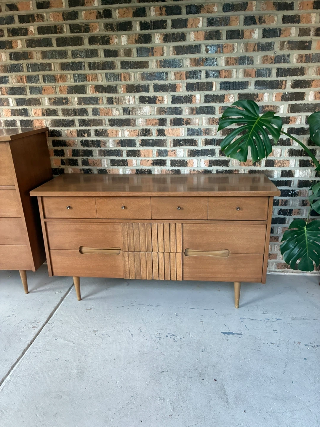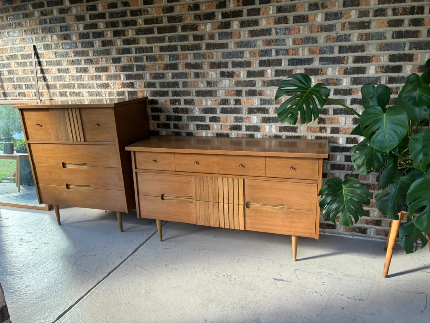 Mid century modern set by Basic witz light walnut color. Low dresser, mirror and tall dresser All of the pieces in great condition and have glass for the top. Pick up in Burbank. Hold with a deposit of $20. Rest cash Price to sell $950 price with or without mirror . Tall dresser 42” x 36” x 19” Low dresser 54” x 31” x 19”