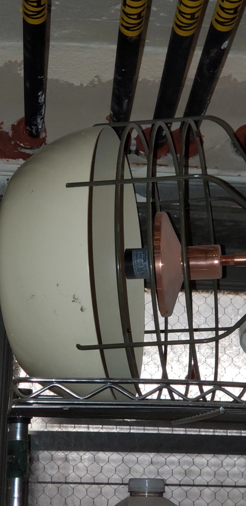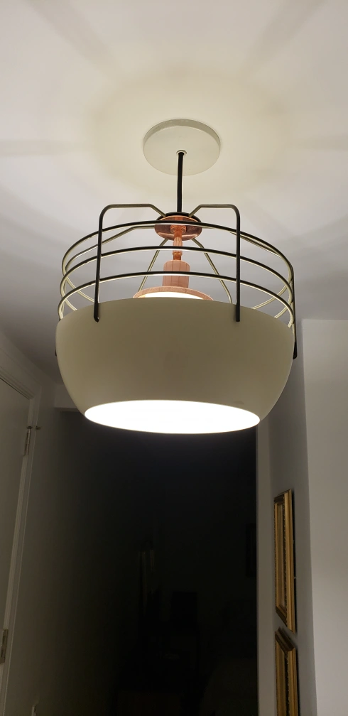 Unique pendant light. Metal cage and off-white shade. Copper colored accents. Good condition. Needs a bulb.