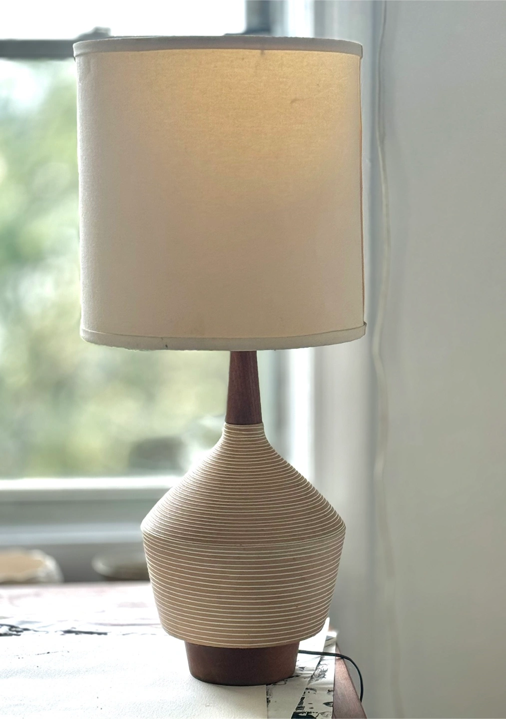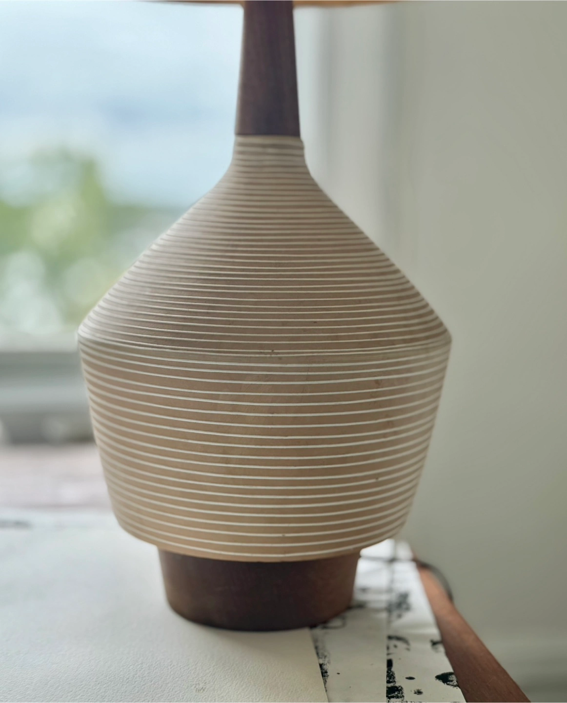 Selling a true vintage mcm table lamp. It has a unique design with a teak base and a striped, ceramic body. It will add a touch of retro style to any room.