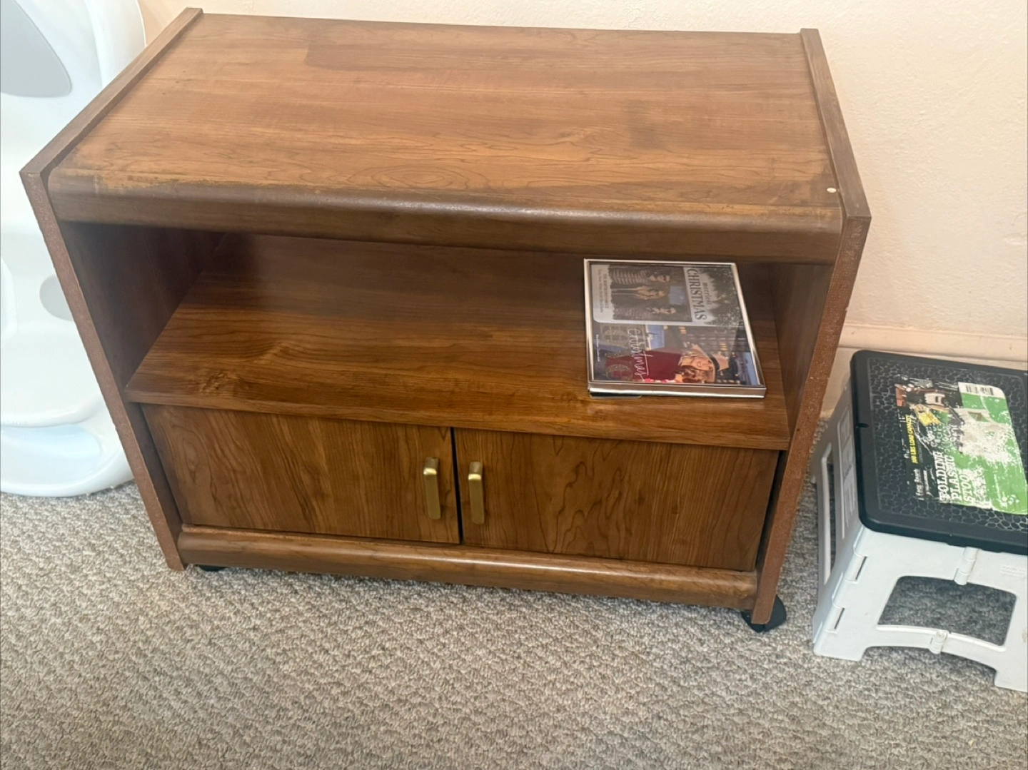 89Small wooden media console. Features a top shelf, cabinet with two doors, and gold knobs. Perfect for small spaces.