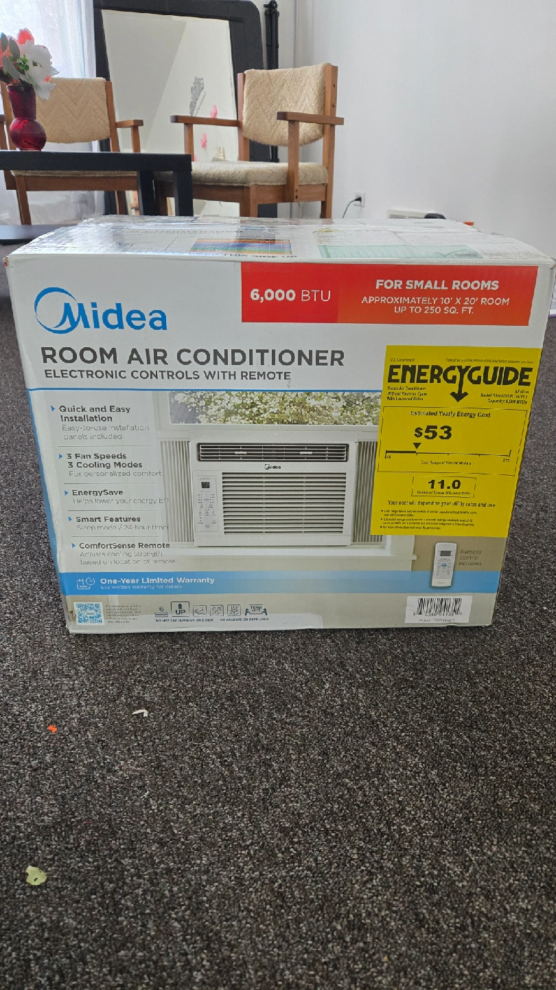 60Move out sale. Selling a used Midea 6,000 BTU room air conditioner! It's still in the original box. This is perfect for small rooms, approximately 10' x 20' room up to 250 sq. ft. It features electronic controls with a remote for easy operation. It also has quick and easy installation and 3 cooling modes for customized comfort! The EnergySave feature helps lower your energy bill, and the ComfortSense remote provides smart features. Box included!