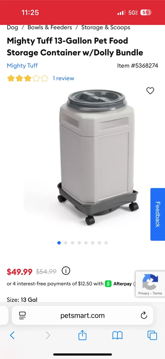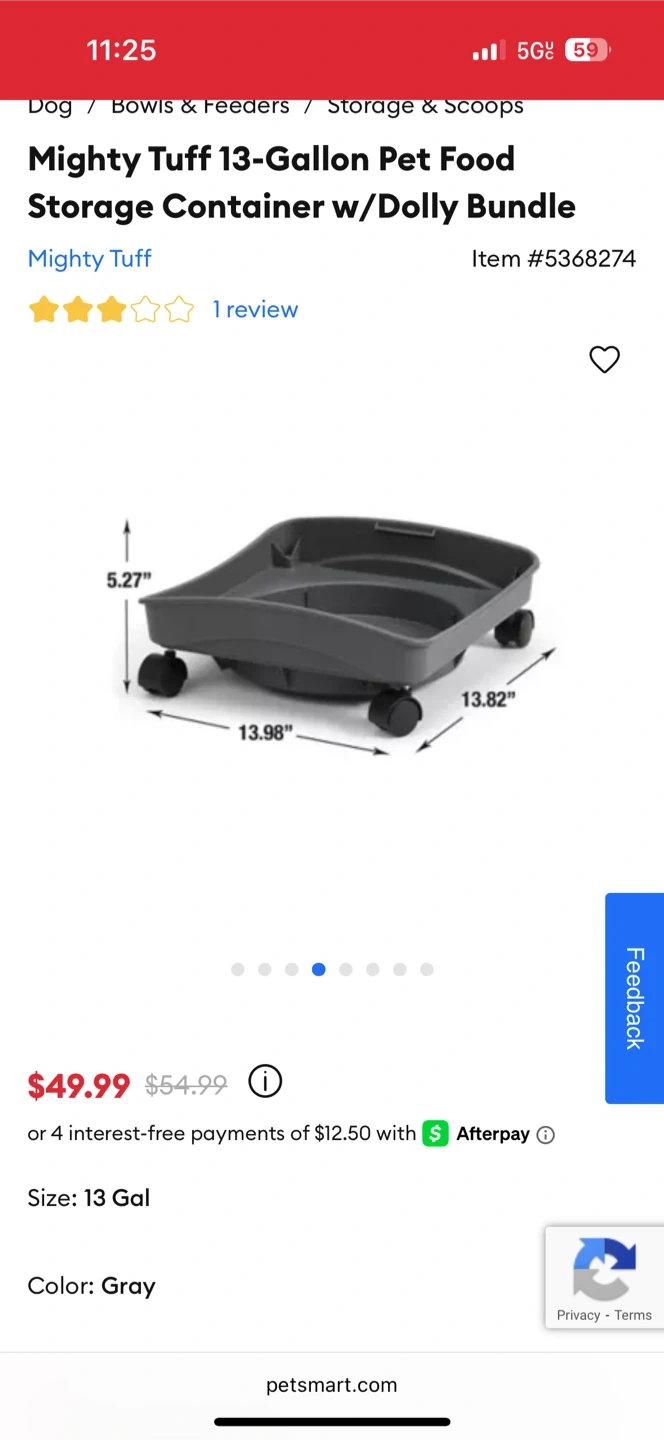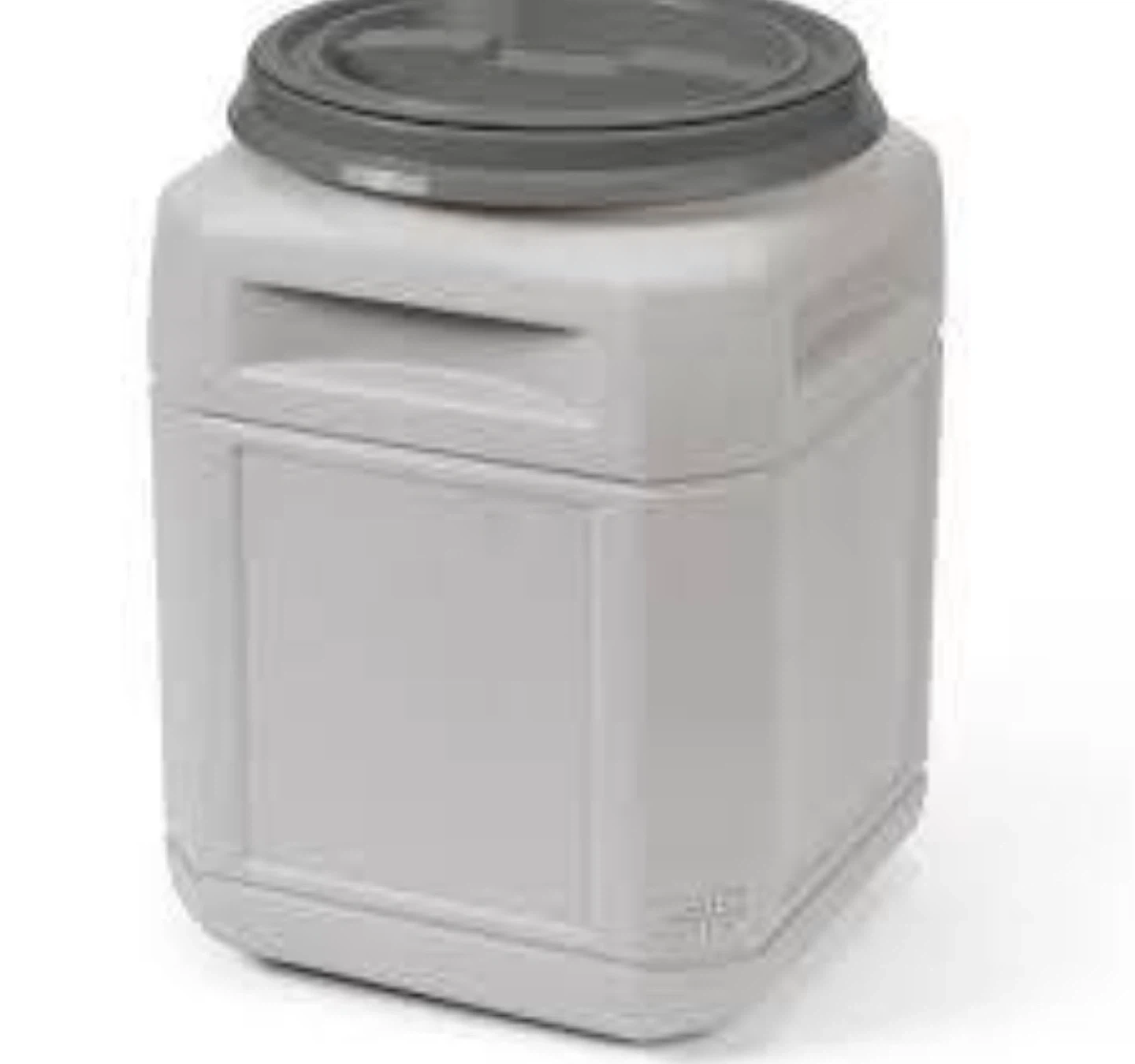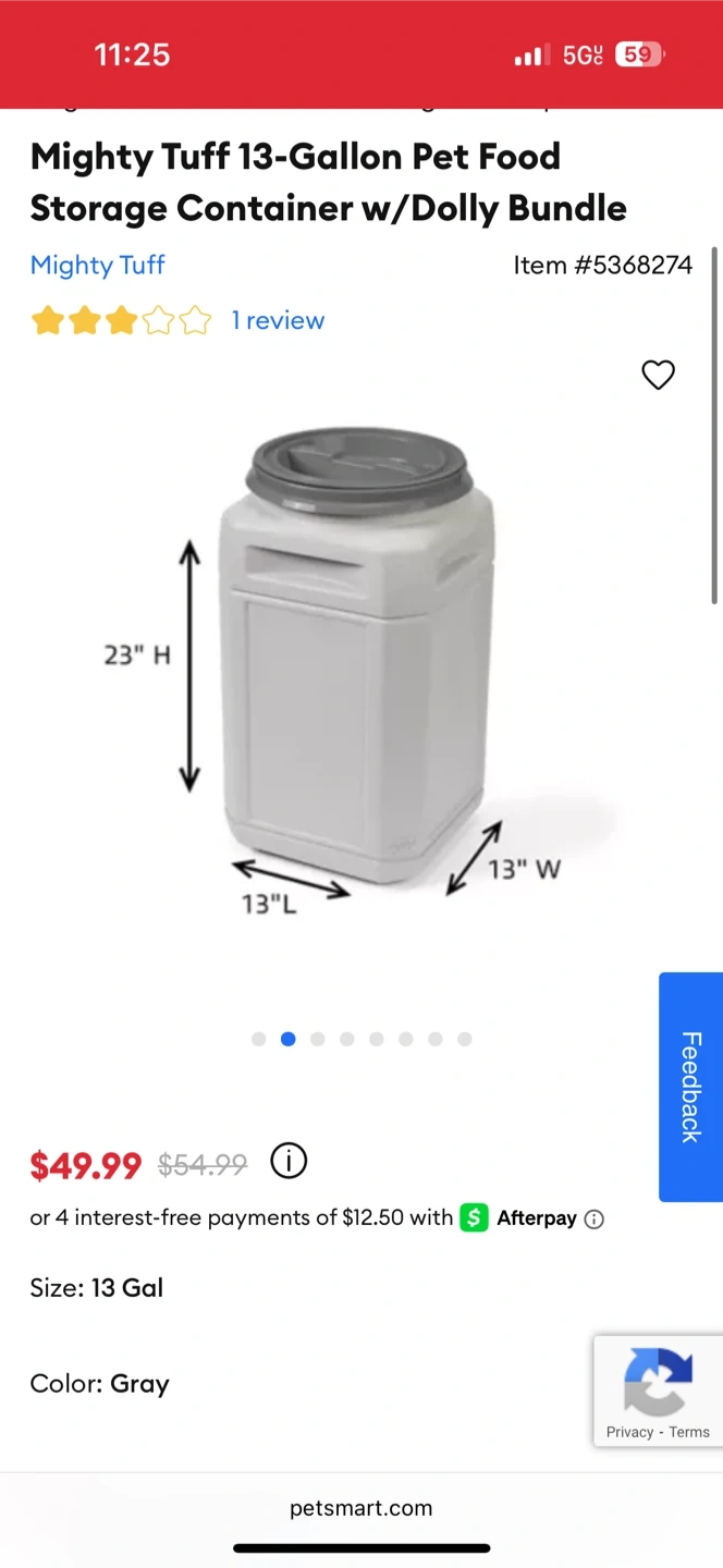 I'm selling a Mighty Tuff 13-Gallon Pet Food Storage Container in gray. It comes with a dolly bundle! It's 23" H x 13" W x 13" L. Originally bought for $49.99