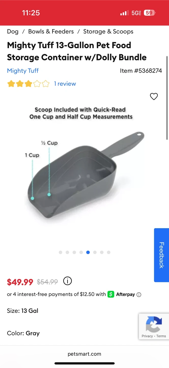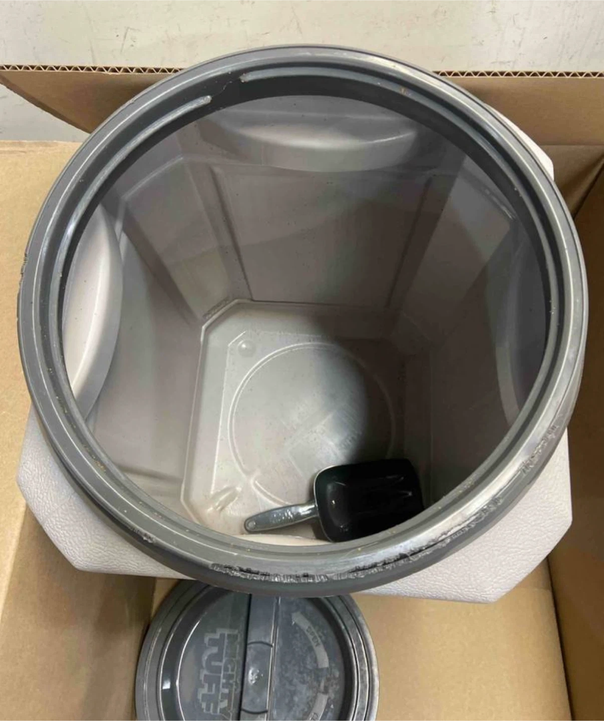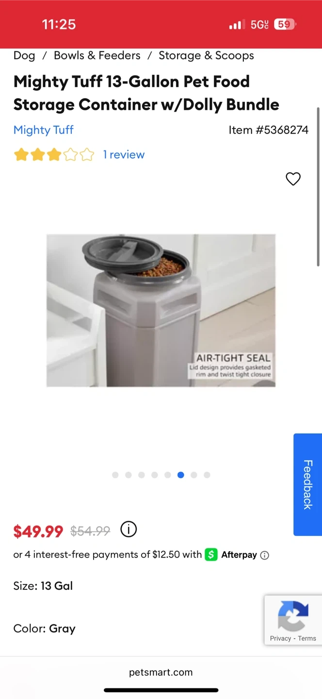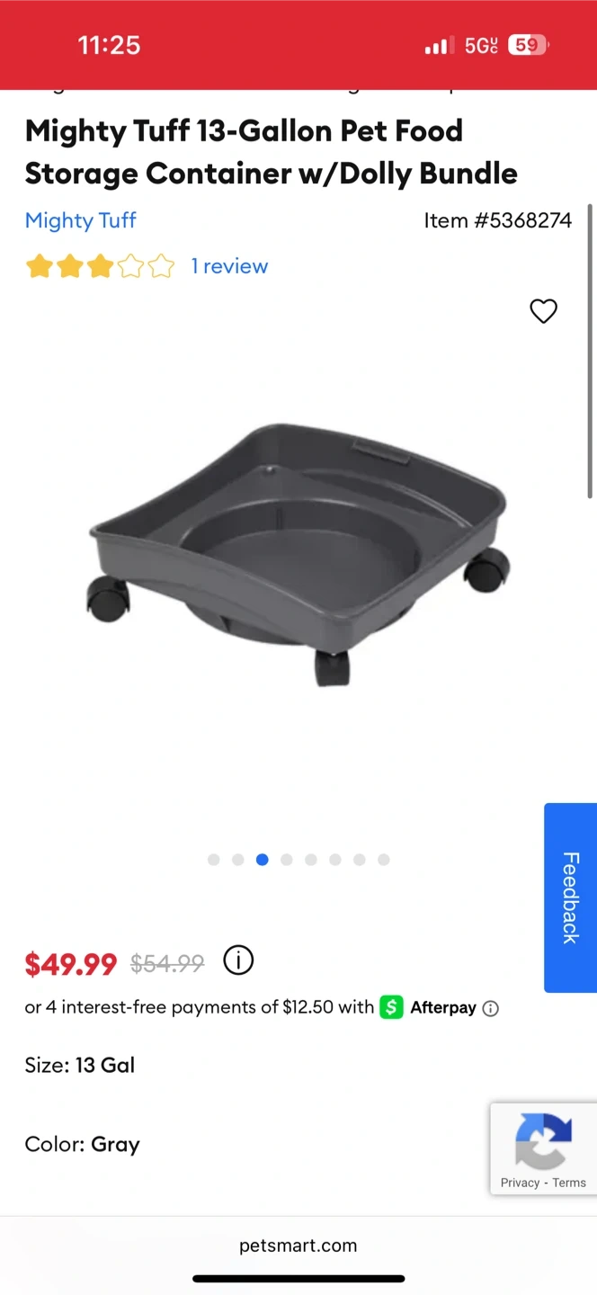 I'm selling a Mighty Tuff 13-Gallon Pet Food Storage Container in gray. It comes with a dolly bundle! It's 23" H x 13" W x 13" L. Originally bought for $49.99