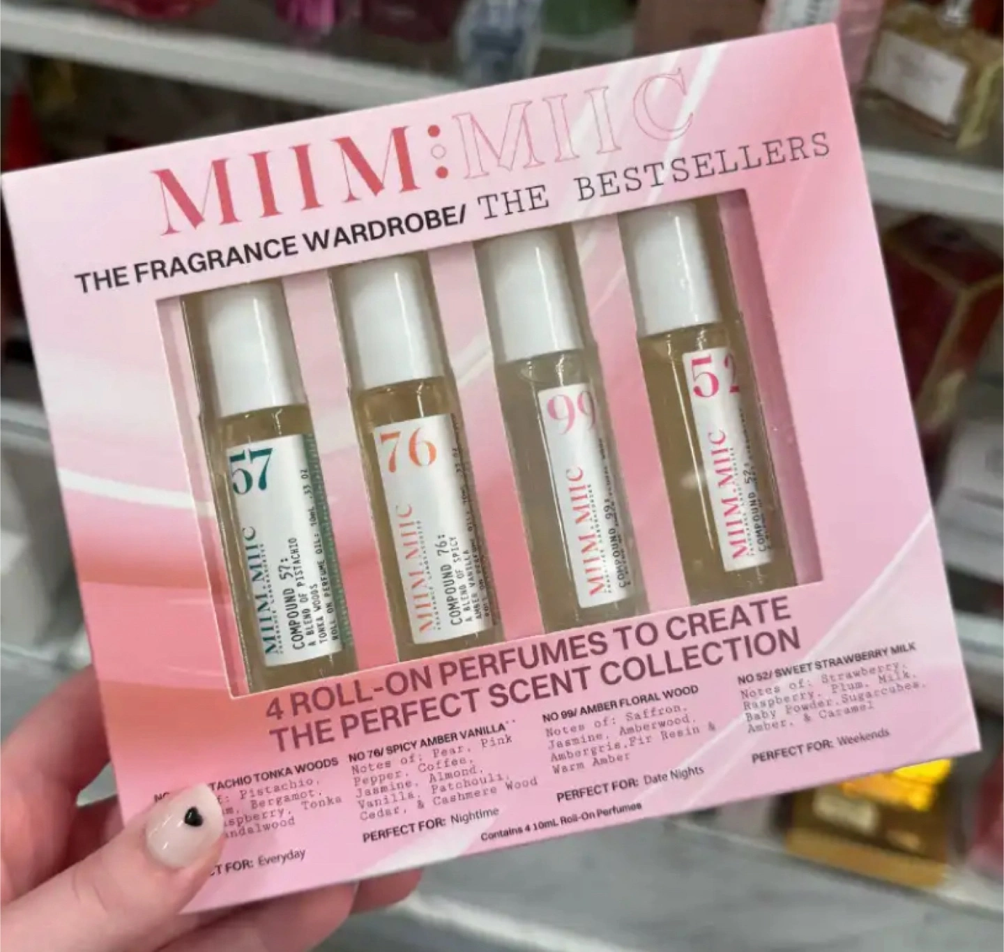 This is a MIIM:MIC The Fragrance Wardrobe/The Bestsellers set! It includes 4 roll-on perfumes to create the perfect scent collection. - No 57/ Pistachio Tonka Woods - No 76/ Spicy Amber Vanilla - No 99/ Amber Floral Wood - No 52/ Sweet Strawberry Milk Each perfume contains 10ml of roll-on perfume oil