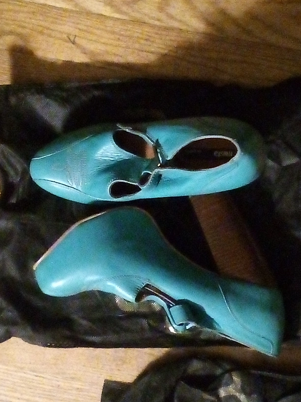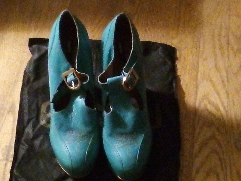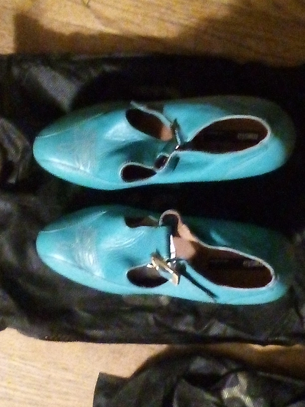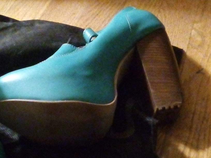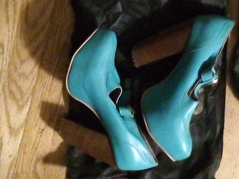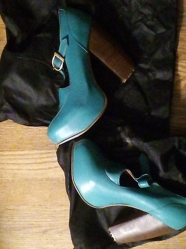 These turquoise leather heels by Miista are in great condition! They feature a unique design with a block heel and a strap across the foot. Perfect for adding a pop of color to your outfit