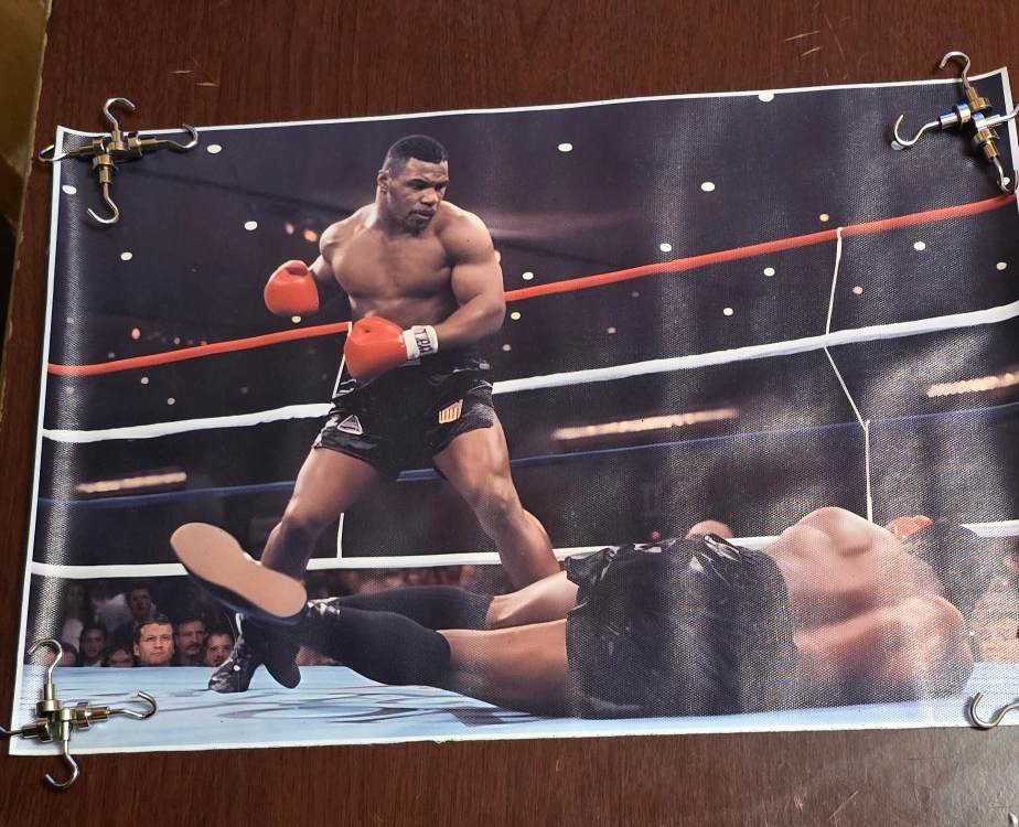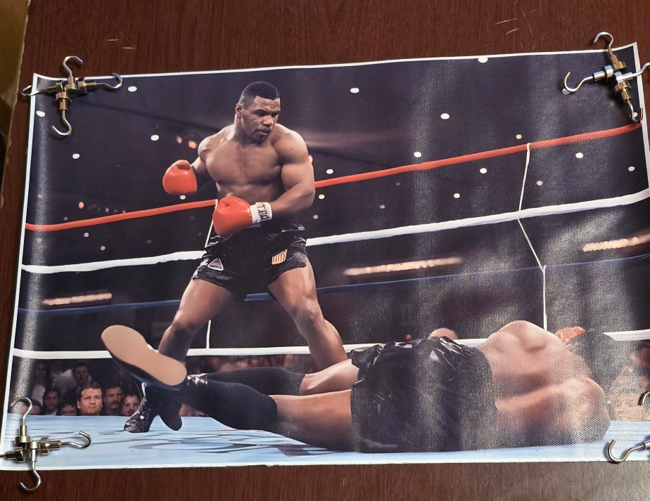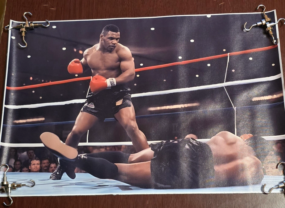 A large poster. Features a boxing match between two fighters. Place this image in your favorite room, and it will calm your thoughts. we frame for free