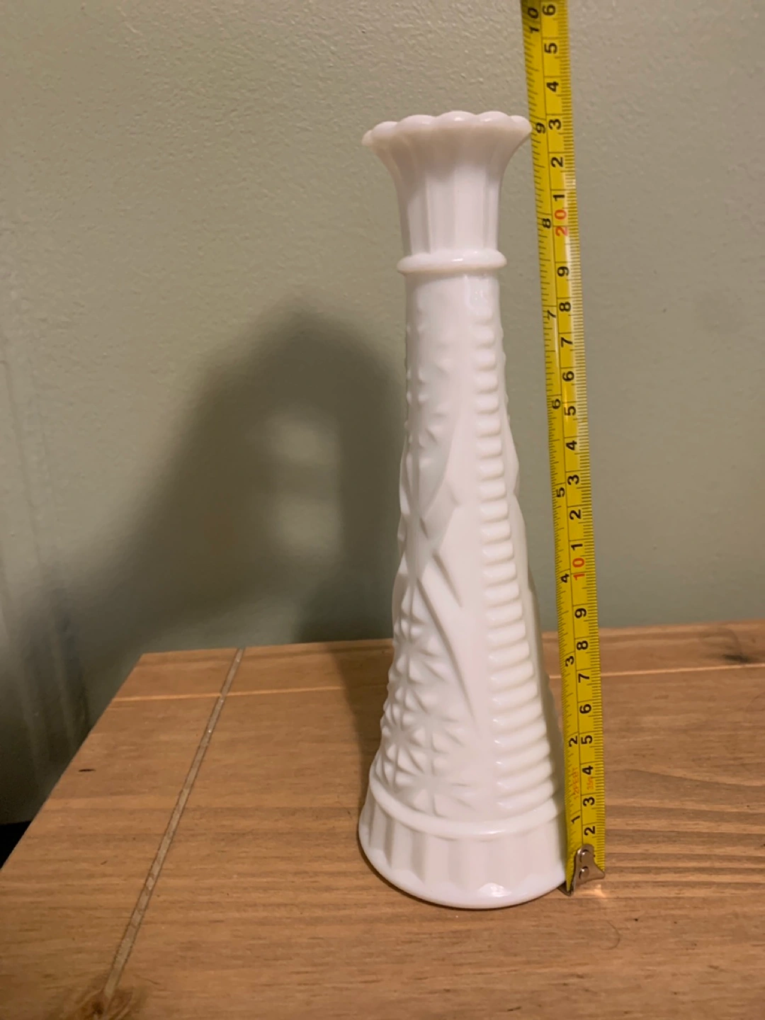 68White milk glass vase. Intricate design. Approximately 9 inches tall.