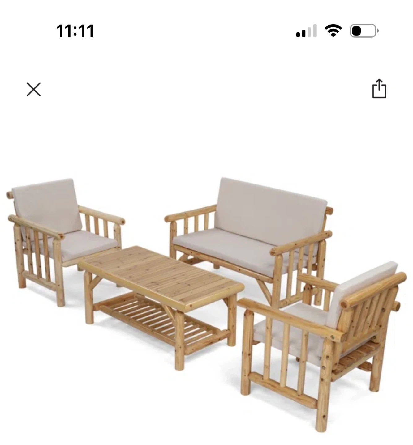 10Selling a Millwood Pines patio conversation set! It includes two chairs, a loveseat, and a coffee table, perfect for enjoying the outdoors. The set is made of wood and has a natural finish. The loveseat is about 42.52" wide and 30.9" tall, the chairs are about 21.26" wide and 30.9" tall, and the coffee table is about 40.35" wide and 18.7" tall. New never been used. We put outside for picture and stored in garage for last week.
