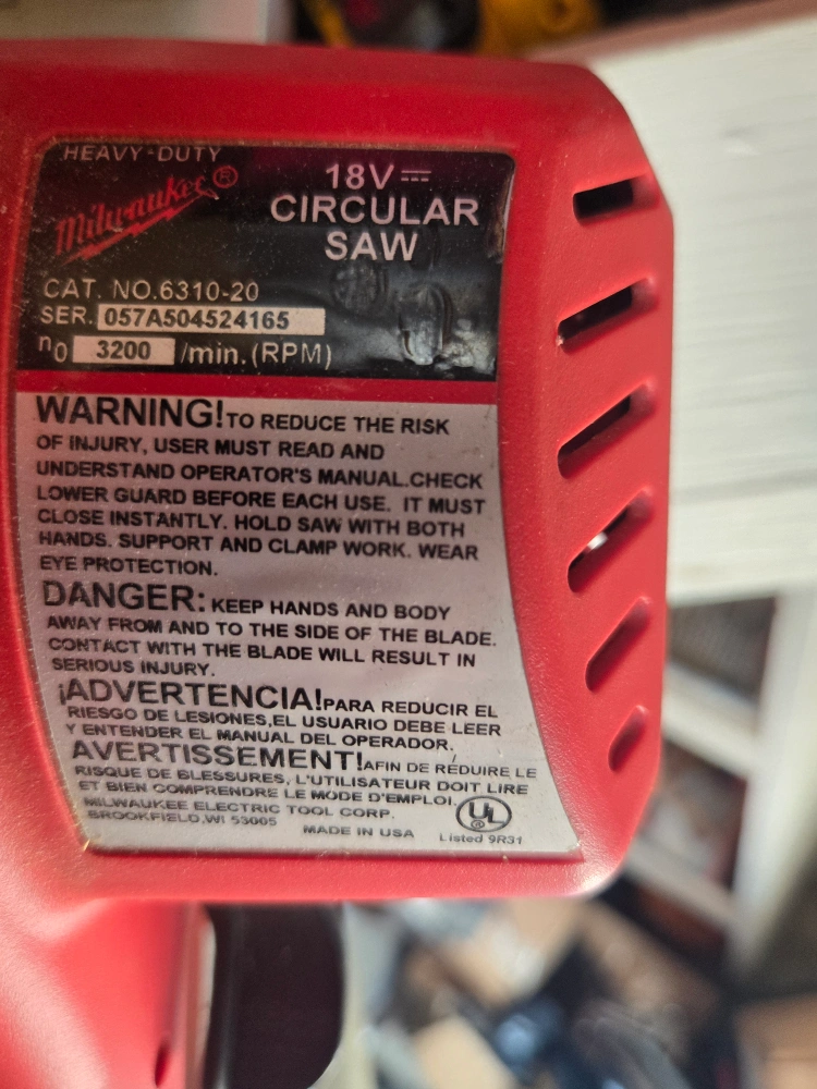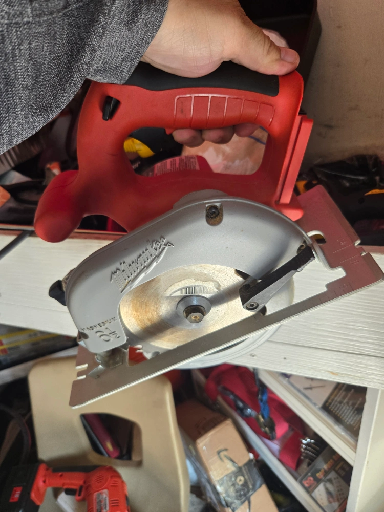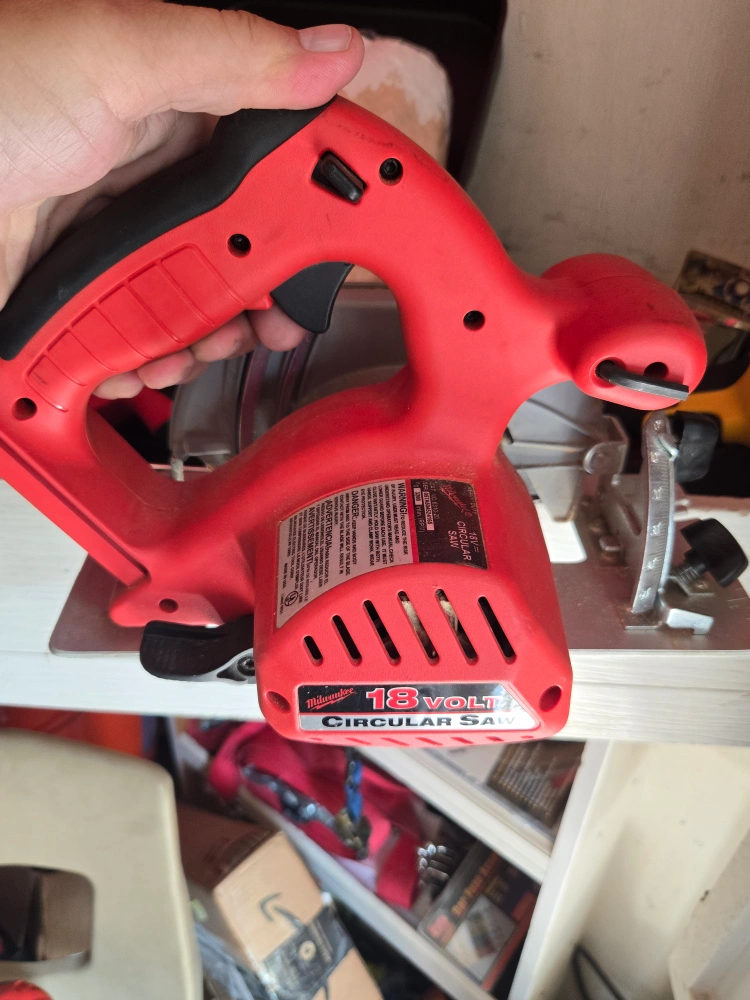 A circular saw.Milwaukee Red and black body. Ready to help you with your next home project, this saw is a great addition to your tool collection.