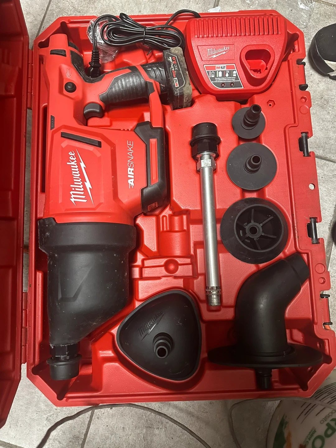 60Selling a Milwaukee AIRSNAKE Drain Cleaning Air Gun Kit! It comes with the charger and all the components in its original box