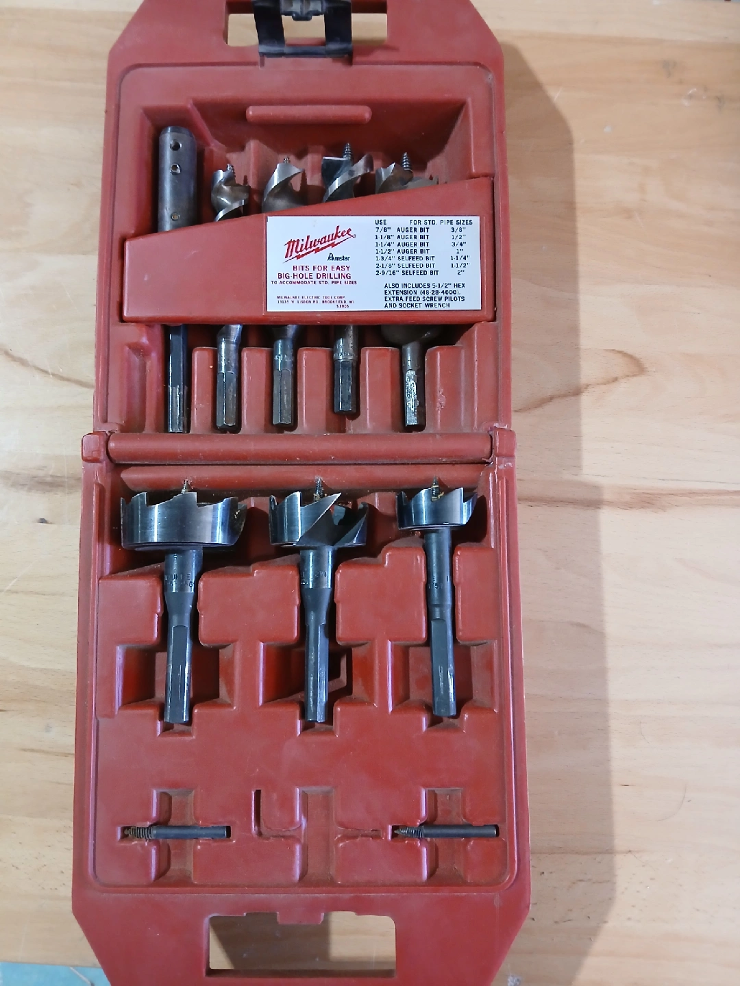 Selling a Milwaukee Amstar Auger Bit Set in its original case! It's designed for easy big-hole drilling to accommodate standard pipe sizes. The set includes various auger bits and self-feed bits, along with a 5-1/2" hex extension, extra feed screw pilots, and a socket wrench